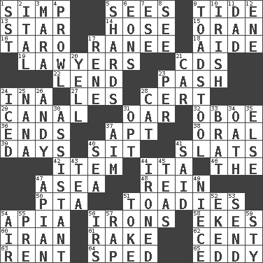 ACROSS 1. Simple or foolish person 5. Perceives with the eye 9. Periodic rise and fall of the sea level 13. Play the lead 14. Flexible conduit 15. Northwest Algerian city 16. Edible starchy tuberous root 17. Indian princess (variant) 18. Helper 19. Those who practice law 21. Music discs 22. Grant temporary use of 23. Romantic infatuation 24. _ tizzy (2 wds.) 27. French article 28. Sure thing 29. Lessep's creation 31. Rowing implement 32. Mitch Miller's instrument 36. Extremities 37. Fitting 38. Taken by mouth 39. 24-hour periods 40. Be seated 41. Narrow boards 42. A distinct part 44. Call ___ day 46. Definite Article 47. Toward the sea 48. It's straight from the horse's mouth 50. Parent Teacher Association (abbr.) 51. Sycophants 54. Capital of Western Samoa 56. Metal shackles 58. Supplements with great effort 60. SW Asia republic 61. Libertine 62. Penny 63. Monthly bill 64. Hurried 65. Whirlpool DOWN 1. Fast jet (abbr.) 2. Slanted text style (abbr.) 3. Hindu Mythology: god of death 4. Move like a hungry wolf 5. Broken pieces 6. Immeasurably long periods of time 7. Compass dir. 8. Observe 9. Inedible or poisonous agaric 10. From or relating to Ireland 11. June honoree 12. Compass dir. 17. French philosopher Descartes 20. Shout 21. 4-wheeled motor vehicle 23. For each 24. On the rocks 25. Nanny 26. "60 Minutes" Commentator Rooney 28. Feline 30. Helper 31. Elect 33. Naughty child 34. Pledge 35. Otherwise 37. Direct toward a target or goal 40. Ocean 41. Stated 43. Beverage made from leaves 44. Pressed 45. Afternoon social gatherings 47. Bee-related 49. Sibling's daughter 51. Casino tip 52. Supplemented with great effort 53. Post 54. Atmosphere 55. Before (prefix) 56. Big collection agency 57. Strike 59. Filthy place