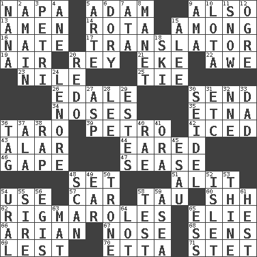 ACROSS 1. California wine valley 5. First of billions? 9. In addition 13. So be it 14. Round or rotation of duties 15. Amid 16. Nathan's nickname 17. Interpreter 19. Atmosphere 20. Marina Del _, California 21. Supplement with great effort 22. Deep reverence 23. The longest river in the world 25. Neckwear 26. Peak District village in England 30. Transmit 34. Olfactory organs 35. Inactive volcano in Sicily 36. Pacific island yam 39. Stone: prefix 42. On the rocks 43. Having or resembling wings 44. Having ears or earlike features 46. Yawn 47. Gospel singer Marvin 48. Arrange properly for use 51. Set down 54. Purpose 57. Automobile 58. The 19th letter of the Greek alphabet 60. Quiet! 62. Complicated, petty procedures 65. Writer Wiesel 66. Believer in; advocate of (suffix) 67. Characteristic smell of wine 68. Elected reps. 69. For fear that 70. Singer James 71. Proofreading order DOWN 1. Nanny 2. At full speed 3. _ dish (used to culture cells) 4. One (Scot) 5. Johnson of "Laugh-In" 6. Small, narrow, flatbottom fishing boat 7. _ moment's notice (2 wds.) 8. French painter Edouard 9. Housemaid (var.) 10. Globular water bottle used in Asia 11. Frozen precipitation 12. Legendary monster 15. Toward shelter 18. What Jean-Claude Killy likes to do 20. Redecorate 24. Poe poem 27. Cleo's killer 28. Area sheltered from the wind 29. _____ Park, CO 30. Beer mug 31. And so on (abbr.) 32. Compass dir. 33. Male parent 36. Label 37. Wing 38. Strike 40. Actress Charlotte 41. Mouth or opening 45. He sold his birthright 48. Glance over 49. Hearing organ 50. Marketplace scale 52. Small island 53. One or ones belonging to thee 54. Mountain range 55. The founder of a family 56. Armor plate that protects the chest 58. Trial 59. At sea 61. Command 63. Floor covering 64. Car dealer's back yard 65. Double-curved letter