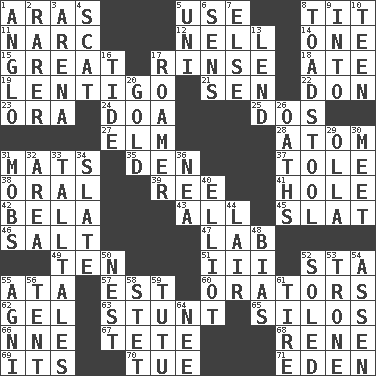 ACROSS 1. Caspian sea tributary 5. Purpose 8. Teat (slang) 11. Drug cop 12. 1994 drama film starring Jodie Foster 14. Single 15. Relatively large 17. Remove soap 18. Had dinner 19. Small, flat, pigmented spot on the skin 21. Elected rep. 22. Spanish title 23. Mouth or opening 24. ___ good deed 25. Two (Sp.) 27. Shade tree 28. Smallest unit of an element 31. Floor protectors 35. Lair 37. Lacquered or enameled metalware 38. Of the mouth 39. To sift 41. Hollow 42. Actor Lugosi 43. 100% 45. Narrow board 46. Table seasoning 47. Experiment locale 49. Nine, plus one 51. One more than two 52. R.R. building 55. _ moment's notice (2 wds.) 57. Eastern Standard Time (abbr.) 60. Speakers 62. Set 63. Check the growth or development of 65. Grain storage towers 66. Compass dir. 67. Wig 68. French philosopher Descartes 69. It is 70. Third day of the wk. 71. Locale of original sin DOWN 1. White American of non-Hispanic descent 2. Less widely known 3. Sports stadium 4. Get outta here! 5. Single; one (prefix) 6. Elected reps. 7. Otherwise 8. Inedible or poisonous agaric 9. To the inside or interior of 10. Adolescent 13. Grant temporary use of 16. Periodic rise and fall of the sea level 17. Wanderer 20. Gilt 26. Profane or obscene expressions 29. Water jar 30. Rendezvous 31. Crowds into 32. Length times width 33. Baron Munchausen's specialties 34. Chalkboard 36. Teachers' org. 40. American author Paul (1891-1958) 44. Den 48. Prejudice 50. A home for chicks 52. Having a sole or soles 53. Marketplace scale 54. NE Netherlands city 55. Hindu god of fire 56. Portable shelter 58. Proofreading order 59. Ballerina skirt 61. Hoop that covers a wheel 64. Born