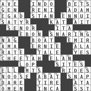ACROSS 1. "___ Maria" 4. _ china 8. Antes 12. Commissioned mil. rank 13. Painter Guido (1575-1642) 14. First man 15. Mild oath 17. Comedian Laurel of Laurel & Hardy 18. World-weariness 19. Letch 21. Krazy ___ of comics 23. Small island 24. Sir (Sp.) 26. Call ___ day 28. Inky black, to poets 30. Catching in a trap 34. Tired old horse 37. Water vessel 39. Independent ruler or chieftain 40. Housemaid (var.) 41. Bert's buddy 43. Insect wing 44. Pace 46. Falsehood 47. Affirmative reply 48. Leopard's kin 51. Flair 54. Trim (branches) 55. Settings 58. Pipe bend 61. Mountains (abbr.) 63. Amusement-park features 65. Trap for birds or small mammals 67. Blind as ____ 71. Fastener 72. Have the gumption 73. Hoop that covers a wheel 74. "One Day ___ Time" 75. Sign of something about to happen 76. South American Indian 77. Fast jet (abbr.) DOWN 1. Matures 2. Viva Las _ 3. Related on the mother's side 4. Big collection agency 5. Fish or hair follower 6. Heredity factor (abbr.) 7. Pig sound 8. Prohibit 9. Pulitzer Prize-winning author Ferber 10. "Change" in Tahitian 11. Stricken, poetically 16. Centimeter-gram-second unit of force 18. Singer James 20. Director Reiner 22. The 18th letter of the Arabic alphabet 25. Loose flowing garment 27. "We ___ not amused" (Victoria) 29. Compass direction 30. Vertical member of a panel or frame 31. "If ____ say so..." 32. Mediterranean tributary 33. Pate de foie ____ 34. Drug cop 35. Nanny 36. Yard entry 38. Santa ___, CA 42. Snakelike fish 45. Snakelike fish 49. Heavy book 50. Fitting 52. Wind 53. Nuclear Threat Initiatives 56. Ferber et al. 57. Theater features 58. Inside; within (prefix) 59. Rich soil 60. Old wives' tales, e.g. 62. Suttee (variant) 64. Argument over a trivial matter 66. Elected rep. 68. Storage container 69. Curve 70. Afternoon social gathering