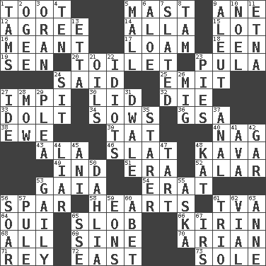ACROSS 1. A blast of a horn 5. Vertical spar for supporting sails 9. A saturated hydrocarbon 12. Match 14. Silent film actress Nazimova 15. Car dealer's back yard 16. Intended 17. Rich soil 18. Car or cant ending 19. Elected rep. 20. Bathroom plumbing fixture 23. Monetary unit of Botswana 24. Expressed in words 25. Give off 27. Body of Kaffir warriors 30. Flaplike covering 32. Expire 33. Stupid person 34. Sty mamas 36. Girls' org. (abbr.) 38. She-sheep 39. Make lace 40. Tired old horse 43. According to 46. Narrow board 48. Polynesian shrub of the pepper family 49. Working for oneself (abbr.) 51. Epoch 52. Having or resembling wings 53. Greek goddess of the earth (variant) 54. Part of Q.E.F. 56. Practice fight 58. Centers of feelings and intuitions 61. Federal power corp. 64. Fr. "Yes" 65. Messy guy 66. Japanese brewing company 68. Everything 69. Trig term 70. Believer in; advocate of (suffix) 71. Marina Del _, California 72. Compass direction 73. Not divided or shared with others DOWN 1. Scottish caps 2. Double curve, resembling the letter S 3. NW Algerian seaport 4. "___ Little Indians" 5. Promenade 6. Medicinal plant 7. Scheduled 8. Scottish cap 9. Eskimo relative 10. Christmas carol 11. Inactive volcano in Sicily 13. Singer James 21. Lubricates 22. Foolish or stupid persons 23. Sliced desserts 24. Be seated 26. Russian fighter aircraft 27. Binary compound 28. Cut the grass 29. Entreaty 31. A sleeping potion; an opiate (poet.) 35. A viewer who gazes fixedly 37. Of or related to the anus 41. Actress Gardner 42. Slender fish 44. One who doesn't tell the truth 45. Cuckoo 47. Small pie 48. Krazy ___ of comics 50. Mexican or Central American flower 53. Lightheartedly 55. "____ silly question..." 56. Fly high 57. Whine 59. Immeasurably long periods of time 60. Collude with 61. Musical group of three 62. Small bottle 63. Queen of England 1702-14 65. Compass dir. 67. Big collection agency