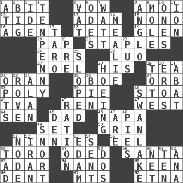 ACROSS 1. "This won't hurt ____!" 5. Promise 8. Mine, in Marseilles 12. Periodic rise and fall of the sea level 13. First of billions? 15. Words to Nanette 16. Representative 18. Wig 19. Small, secluded valley 20. Infant food 22. Paper fasteners 24. Blunders 26. Nilotic language 27. Christmas carol 28. Part of HMS, perhaps 29. Afternoon social gathering 32. Northwest Algerian city 35. Mitch Miller's instrument 37. Globe 38. Much (prefix) 39. Sliced dessert 40. Portico 41. Federal power corp. 42. Painter Guido (1575-1642) 43. Compass direction 44. Elected rep. 45. Male parent 46. California wine valley 49. Arrange properly for use 50. Amused look 51. Simpletons 55. Snakelike fish 56. "Corrida" creature 57. Wrote a lyric poem 59. Before Barbara or Clara 63. The sixth month of the Jewish calendar 64. Billionth: prefix 65. Peachy ____! 66. Incision 67. Mountains (abbr.) 68. Inactive volcano in Sicily DOWN 1. _ moment's notice (2 wds.) 2. Large 3. Binary compound 4. 3-inch nail 5. Large container 6. Lyric poems 7. Electrical Unit 8. White American of non-Hispanic descent 9. Undercover agent 10. Washington bills 11. Electrically charged atom 14. Ear of corn 17. Pacific island yam 21. Before (prefix) 23. Purulenc 25. Had an oblique or slanted direction 28. Weeding 29. Lug 30. Greek god of love 31. Blind as ____ 32. Elects 33. Be footloose 34. Actor Alda or Thicke 36. Storage container 40. Tchaikovsky ballet 42. Food allowance for one day 45. Lair 47. "We ___ not amused" (Victoria) 48. Sliced desserts 49. Derisive sound 51. Connecting point 52. SW Asia republic 53. Dutch treat 54. Emitted 56. Small boy 58. Two (Sp.) 60. Fish or hair follower 61. "___ Little Indians" 62. Santa ___, CA
