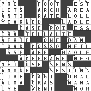 ACROSS 1. Before (prefix) 4. Lowest support of a structure 8. Eastern Standard Time (abbr.) 11. Allows 13. Bowlike part 14. Length times width 15. Against 16. Assign a rank or rating to 17. Hang loosely or laxly 18. Felt deep pity or tenderness 21. Dipping utensil 22. Comfort 23. Luau course 25. Double-curved letter 26. Period 29. Copy Pinocchio 32. Nest on high 34. Single 35. Daniel's nick name 38. Frog relative 39. With motion or animation 41. Famous astronaut Armstrong 43. Compass dir. 44. Mature 45. White Person, in Hawaii 46. Electrical Measurement 50. Modern: prefix 51. Fish or hair follower 54. Purpose 55. Elected reps. 57. Amid 59. French poetic form 63. Become fatigued 64. Wise men 67. Mountain range 68. _ mater 69. Mouths or openings 70. Grandmother 71. Sodium hydroxide 72. Gone 73. Not either DOWN 1. Shaw product 2. French philosopher Descartes 3. Singer James 4. Bundle 5. Mouth or opening 6. Sep. follower 7. Definite Article 8. Eat (away) 9. Makes a sale 10. Falsehoods 12. Title for a man of rank and authority 14. Chicken ___ king 19. Nathan's nickname 20. Compass dir. 21. Cards in a Roman deck? 23. Baking dishes 24. Margarine 26. Consume 27. Vintage cars 28. Caspian sea tributary 30. Failure 31. Pulitzer Prize-winning author Ferber 33. It may be bright or harebrained 36. A really long time 37. The longest river in the world 39. Atlas contents 40. Double curve, resembling the letter S 42. Lion 45. Coop moms 47. Large cup 48. Aid 49. Turn to the right 51. Brizilian seaport 52. Poet Dickinson 53. Singer Mel 56. Surprise greatly 58. Teachers' org. 60. SW Asia republic 61. Billionth: prefix 62. Having or resembling wings 64. Cut the grass 65. "We ___ not amused" (Victoria) 66. Separate the seeds from cotton