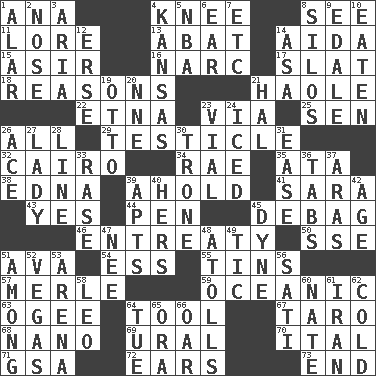 ACROSS 1. Santa ___, CA 4. Leg joint 8. Observe 11. Old wives' tales, e.g. 13. Blind as ____ 14. Opera by Verdi 15. SW Saudi Arabia district 16. Drug cop 17. Narrow board 18. Thinks logically 21. White Person, in Hawaii 22. Inactive volcano in Sicily 23. By way of 25. Elected rep. 26. Everything 29. One of the two male reproductive glands 32. Capital of Egypt 34. Actress Charlotte 35. "One Day ___ Time" 38. Pulitzer Prize-winning author Ferber 39. Hold, grip (Informal) 41. "Two Mules for Sister ____" 43. Affirmative reply 44. Fenced enclosure 45. Debunk (Brit. slang) 46. Plea 50. Compass dir. 51. Actress Gardner 54. Double-curved letter 55. Airtight sealed metal containers 57. Haggard of country music 59. Pertaining to the sea 63. Double curve, resembling the letter S 64. Instrument 67. Edible starchy tuberous root 68. Billionth: prefix 69. Mountain range 70. Slanted text style (abbr.) 71. Girls' org. (abbr.) 72. Hearing organs 73. Conclusion DOWN 1. Having or resembling wings 2. Olfactory organ 3. Roberta Peters solo 4. Sunflower state 5. Basketball assoc. 6. Ewer handle 7. And so on (abbr.) 8. Grain storage towers 9. Peak District village in England 10. Consumed 12. Celtic language 14. White ___ sheet 19. "Beetle Bailey" pooch 20. Compass dir. 21. Actor Linden 23. Small bottle 24. On the rocks 26. Adept person 27. Kenny Rogers chart-topper in '80 28. Actor's bit 30. Marketplace scale 31. Relaxation 33. To erase 36. Bar bills 37. Caspian sea tributary 39. Flats, for short 40. Possessive pronoun 42. Personal question 45. Unit of force 47. Born 48. Ringlike coral islands and reefs 49. Nervous spasm 51. Amid 52. Viva Las _ 53. Sports stadium 56. Suttee (variant) 58. Lion 60. Nathan's nickname 61. SW Asia republic 62. Having a low temperature 64. Third day of the wk. 65. Mouth or opening 66. Rowing implement