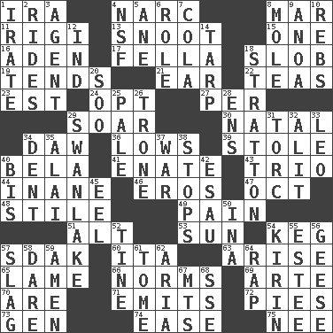 ACROSS 1. Retirement account (abbr.) 4. Drug cop 8. Impair 11. Swiss mountan, "Queen of the Mountains" 13. Snout, nose 15. Single 16. An important port of Yemen 17. Chap (slang) 18. Messy guy 19. Watches over 21. Hearing organ 22. Beverages made from leaves 23. Eastern Standard Time (abbr.) 24. Choose 27. For each 29. Fly high 30. Relating to or accompanying birth 34. Simpleton 36. Coldest temperatures 39. Took without asking 40. Actor Lugosi 41. Related on the mother's side 43. Musical group of three 44. Silly 46. Greek god of love 47. Sep. follower 48. Vertical member of a panel or frame 49. Ache 51. Keyboard modifier key 53. Player for Phoenix 54. Cask 57. Neighbor of Neb. 60. Call ___ day 63. Get up 65. Unable to walk 66. Typical models 69. Johnson of "Laugh-In" 70. "We ___ not amused" (Victoria) 71. Sends forth 72. Sliced desserts 73. Commissioned mil. rank 74. Relaxation 75. Born DOWN 1. Feeling or showing extreme anger 2. Amusement-park features 3. Representative 4. Science/research agcy. 5. A saturated hydrocarbon 6. Hero or heavy, e.g. 7. Root beer relative 8. Undercover agent 9. Small Philippine buffalo 10. Confederate soldiers (slang) 12. Indiana (abbr.) 14. Canvas cover 18. Ski resort town in Vermont 20. "Barney Miller" actor Jack 25. Diluted with white 26. Marketplace scale 28. Followers of ems 29. Tchaikovsky ballet 31. Torque (variant) 32. Set down 33. Lion 34. Gouge 35. Mountain range southwest of Kyrgyzstan 37. Armed conflict 38. Ceases 40. Twice 42. Son of Isaac 45. Snakelike fish 50. _ tizzy (2 wds.) 52. Prong on a fork 54. Japanese brewing company 55. First name in cosmetics 56. Honkers 57. Volcanic refuse 58. Have the gumption 59. So be it 61. Heavy book 62. Roberta Peters solo 64. Reproach for some lapse or misdeed 67. Mountains (abbr.) 68. Compass dir.