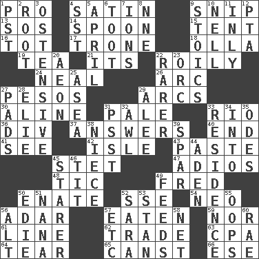 ACROSS 1. Adept person 4. Smooth fabric 9. Sever or remove by pinching or nipping 13. Mayday 14. Soup utensil 15. Portable shelter 16. Small child 17. Marketplace scale 18. Water jar 19. Beverage made from leaves 21. ___ a Wonderful Life 22. Turbulent 24. Actress Patricia 26. Curve 27. Mexican monetary units 29. Arches 30. Place in a line 31. Diluted with white 33. River (Sp.) 36. HTML Container Element 37. Replies (to) 40. Conclude 41. Perceive with the eye 42. Capri or Wright 43. Thick mixture 45. Proofreading order 47. Goodbye (Sp.) 48. Nervous spasm 49. Flintstone 50. Maternal 52. Compass dir. 54. Modern: prefix 56. The sixth month of the Jewish calendar 57. Eroded 59. Or not 61. Actor's bit 62. Barter 63. Numbers guy (abbr.) 64. Rend 65. 2nd pers. sing. pres. of can (arch.) 66. Compass dir. DOWN 1. Pacific Standard Time (abbr.) 2. Carrot, for example 3. Clearly or manifestly demonstrative 4. Fast jet (abbr.) 5. Showery time 6. A blast of a horn 7. Charged particles 8. Compass dir. 9. Unemotional ones 10. 1994 drama film starring Jodie Foster 11. Inwardly 12. Parent Teacher Association (abbr.) 20. A really long time 22. More valued for its uncommonness 23. The grampus (Milton) 25. At sea 27. Writing tablets 28. Writer Wiesel 29. Toward shelter 31. Inconspicuous attention getter 32. Leather borer 33. Home 34. To the inside or interior of 35. Lyric poems 38. Sibling's daughter 39. Practice fight 44. An important port of Yemen 45. A viewer who gazes fixedly 46. Teat (slang) 49. Gives food to 50. Singer Brickell 51. Nanny 52. "Two Mules for Sister ____" 53. Comedian Laurel of Laurel & Hardy 55. I made a mistake 56. The first octave above the treble staff 57. And so on (abbr.) 58. Fish or hair follower 60. Actress Charlotte