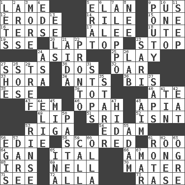 ACROSS 1. Unable to walk 5. Enthusiasm 9. Festering 12. Eat (away) 14. Cause heat under the collar 15. Single 16. Laconic 17. Toward shelter 18. Shoshoni 19. Compass dir. 20. Portable computer 23. Close up, plug up 24. SW Saudi Arabia district 25. Live dramatic performance 27. Fast planes 30. Two (Sp.) 32. Boat paddle 33. Israeli folk dance 34. Pismires 36. Altar cloth linen 38. Compass dir. 39. Small child 40. Had dinner 43. Opposite of masc. 46. Brightly colored fish 48. Capital of Western Samoa 49. Mouth edge 51. _ Lanka 52. Is not 53. Capital of Latvia 54. Dutch treat 56. Singer Brickell 58. Tallied 61. Friend of Pooh 64. Separate the seeds from cotton 65. Slanted text style (abbr.) 66. Amid 68. Big collection agency 69. 1994 drama film starring Jodie Foster 70. Mother 71. Perceive with the eye 72. Silent film actress Nazimova 73. Raze (variant) DOWN 1. Allows 2. Ancient Greek god of war 3. Greater amount 4. Begley and Asner 5. Part of Q.E.F. 6. _ and Stitch 7. City in Syria 8. Born 9. Inclined to pout 10. To (old English) 11. Ooze 13. Snakelike fish 21. Opera by Verdi 22. Right away 23. Indian skirt 24. White ___ sheet 26. Experiment locale 27. A female animal or person 28. Mayday 29. Not kosher 31. Constricts 35. A viewer who gazes fixedly 37. Plant excrements 41. Metal container 42. Ingest 44. Writer Wiesel 45. Russian fighter aircraft 47. Flintstone garb 48. Direct toward a target or goal 50. Soft color 53. Remove soap 55. First of billions? 56. The front part of a cuirass 57. Have the gumption 59. Give a ring to 60. Water jar 61. Roll call or roster of names 62. Singles 63. Legendary monster 65. _ tizzy (2 wds.) 67. Impair