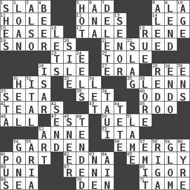 ACROSS 1. Broad, flat, thick piece 5. Possessed 8. According to 11. Hollow 12. Washington bills 14. Part of a journey 15. Artist's stand 17. Falsehood 18. French philosopher Descartes 19. Sounds asleep 21. Followed as a consequence or result 23. Make a knot 25. Lacquered or enameled metalware 26. Small island 27. Epoch 28. To riddle 31. Part of HMS, perhaps 33. Pipe bend 35. American astronaut and politician John 37. Bristle 38. Put into a specified state 40. Probability 41. Pulls apart 43. Make lace 45. Friend of Pooh 46. 100% 47. Eastern Standard Time (abbr.) 50. Ubangi River tributary 52. Singer Murray 53. Call ___ day 54. Place where plants grow 56. Develop 61. Left side of a ship or aircraft 62. Pulitzer Prize-winning author Ferber 65. Poet Dickinson 66. Corn or form start 67. Painter Guido (1575-1642) 68. Russian composer Stravinsky 69. Ocean 70. Lair 71. Not wild DOWN 1. "______ My Girl" (Turtles hit) 2. Grant temporary use of 3. In addition 4. Fermented drink made from hops 5. Being at a high temperature 6. Santa ___, CA 7. Keyboard key 8. Toward shelter 9. Grant temporary use of 10. Personal question 13. Sir (Sp.) 16. Allows 18. Regret 20. Filth; sediment 22. Volcanic refuse 24. Snakelike fish 26. Austrian river, tributary to the Danube 28. Redecorate 29. Inside; within (prefix) 30. Followers of ems 31. The bottom of a shoe or boot 32. Slanted text style (abbr.) 34. Allow 36. Old wives' tales, e.g. 37. R.R. building 39. "Change" in Tahitian 42. Post 44. False hair 48. Contemptuous expression 49. Looked after 51. Unable to walk 52. Tate display 54. Went 55. Roberta Peters solo 57. Send forth 58. Capital of Latvia 59. Take by theft 60. Jane of fiction 61. Suppuration 63. Compass dir. 64. The 18th letter of the Arabic alphabet