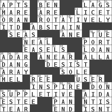 ACROSS 1. Flats, for short 5. Benjamin's nick name 8. Falls behind 12. Female horse 13. "We ___ not amused" (Victoria) 14. It is permitted: Lat. 15. NW Algerian seaport 16. Rotating or pertaining to rotation 19. It would 20. Choose not to consume 21. Oceans 23. A saturated hydrocarbon 24. Third day of the wk. 27. Be tempered by heat 30. Left side of a ship or aircraft 31. Artist's stands 34. Grant temporary use of 35. The sixth month of the Jewish calendar 38. Approach 40. Silent film actress Nazimova 41. Mild oath, euphamism for damn 42. Stop 44. Like ___ of sunshine 45. Not divided or shared with others 46. Cartoonist voice _ Blanc 47. Portuguese money of account (variant) 50. One who makes use of a thing 53. Stimulate to action 57. Spanish title 59. Supplying deficiencies 63. Opera by Verdi 64. First name in cosmetics 65. Baking dish 66. Nuclear Threat Initiatives 67. Pull into pieces 68. Conclude 69. Is not DOWN 1. Mine, in Marseilles 2. Components 3. Swap 4. Elected rep. 5. Sharp remark 6. Greek god of love 7. Remaining after all deductions 8. 54 in ancient Rome 9. Adept person 10. Set 11. Filthy place 14. Actor's bit 17. Auto club (abbr.) 18. Metal container 20. Toward the sea 22. Disorder of the immune system 24. Utensil 25. Mountain range 26. Inactive volcano in Sicily 28. White ___ sheet 29. Grant temporary use of 30. Food holders 32. Area sheltered from the wind 33. Backtalk 35. First of billions? 36. Have the gumption 37. Of or related to the anus 39. River (Sp.) 43. Turn sharply 47. Cause heat under the collar 48. Compass dir. 49. Eastern Standard Time (abbr.) 51. Proofreads 52. "The Thinker" sculptor 54. Corncob 55. "Terrible" tsar 56. Tear apart 58. Political cartoonist Thomas 59. Put into a specified state 60. Purpose 61. Parent Teacher Assoc. 62. For each 63. Black tropical American cuckoo