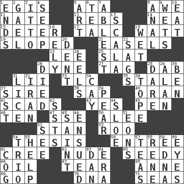 ACROSS 1. The front part of a cuirass 5. _ moment's notice (2 wds.) 8. Deep reverence 11. Nathan's nickname 12. Confederate soldiers (slang) 14. Teachers' org. 15. Prevent from occurring 17. Baby powder 18. Electrical Unit 19. Slanted 21. Artist's stands 23. Area sheltered from the wind 25. Narrow board 26. Centimeter-gram-second unit of force 27. Label 28. Apply (a substance) by light strokes 31. Cards in a Roman deck? 33. Affectionate concern, for short 35. Lacking originality or spontaneity 37. Father 38. Plant excrement 40. NW Algerian seaport 41. Tons 43. Affirmative reply 45. Animal enclosure 46. Nine, plus one 47. Compass dir. 50. Toward shelter 52. Comedian Laurel of Laurel & Hardy 53. Friend of Pooh 54. College paper 56. Main course 61. Algonquian 62. Unadorned 65. Full of seeds 66. Petroleum 67. Pull apart 68. Singer Murray 69. Republican Party 70. Heredity factor (abbr.) 71. Oceans DOWN 1. Conclusions 2. Highlander 3. "Tell ____ the Marines!" 4. Ooze 5. Nonscientific branch of learning 6. Beverage made from leaves 7. Most capable 8. Of or related to the anus 9. Moistens 10. Ingest 13. Any of the three canals of the cochlea 16. Trust 18. Soggy 20. Incision 22. Settles 24. Snakelike fish 26. Passed on 28. Have the gumption 29. Actor Alda or Thicke 30. Benjamin's nick name 31. Louse (plural) 32. SW Asia republic 34. Island 36. Drink excessively 37. Fast jet (abbr.) 39. Lightbulb-shaped fruit 42. Fast planes 44. _ gin 48. Virtuous person 49. Followed as a consequence or result 51. Immeasurably long periods of time 52. Observe 54. Musical group of three 55. Assist 57. Beverages made from leaves 58. French philosopher Descartes 59. Pulitzer Prize-winning author Ferber 60. Snake ____ (dice throw) 61. Gear tooth 63. One of the 12 tribes of Israel 64. Epoch
