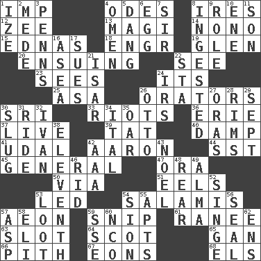 ACROSS 1. Naughty child 4. Lyric poems 8. Angers 12. Last letter of the English alphabet 13. Wise men 14. Words to Nanette 15. Ferber et al. 18. Engineer (abbr.) 19. Small, secluded valley 20. Taking place subsequently 22. Perceive with the eye 23. Observes 24. ___ a Wonderful Life 25. White ___ sheet 26. Speakers 30. Indian title of respect (Mr.) 33. Disturbances 36. 4th largest of the Great Lakes 37. Moving, as bait 39. Make lace 40. Moist 41. Freehold land 42. Composer Copland 44. Fast jet (abbr.) 45. Commissioned military rank 47. Mouth or opening 50. By way of 51. Snakelike fish 53. Directed 54. Deli grouping 57. A really long time 59. Clip 61. Indian princess (variant) 63. Notch 64. Highlander 65. Separate the seeds from cotton 66. Heart or essence 67. Immeasurably long periods of time 68. Raised railways DOWN 1. Ending with capital 2. Ancient Persian 3. Actor Sean's family 4. Sign of something about to happen 5. Mild oath, euphamism for damn 6. Ovum 7. Title for a knight 8. Swallowed 9. Hero or heavy, e.g. 10. Compass dir. 11. Male offspring 16. At sea 17. Institutes legal proceedings 21. Austrian river, tributary to the Danube 22. R.R. building 24. Big collection agency 26. "Beetle Bailey" pooch 27. Mouths or openings 28. Basketball hoops 29. Back-to-school mo. 30. Snaillike creature with no shell 31. Travel on or in a vehicle 32. "Terrible" tsar 34. Slanted text style (abbr.) 35. Rowing implement 38. Veterans Day date 42. Auto club (abbr.) 43. Christmas carol 46. To free from 48. Posterior 49. _ mater 52. Scorch 53. Plunder 54. The Jewish people; Israel 55. Tenement units (abbr.) 56. Lick closed 57. Cleo's killer 58. Biblical high priest 59. Compass dir. 60. Non-commissioned officer (abbr.) 62. Followers of ems