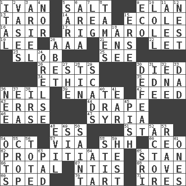 ACROSS 1. "Terrible" tsar 5. Table seasoning 9. Liveliness 13. Pacific island yam 14. Length times width 15. Learning spot: Fr. 16. SW Saudi Arabia district 17. Frustrating wastes of time 19. Area sheltered from the wind 20. Auto club (abbr.) 21. Followers of ems 22. Allow 23. Messy guy 25. Observe 26. Musical pauses 30. Passed on 34. Moral principle 35. Pulitzer Prize-winning author Ferber 36. Famous astronaut Armstrong 39. Maternal 42. Nourish 43. Blunders 44. Window treatment 46. Relaxation 47. Damascus' land 48. Curvy letter 51. Play the lead 54. Sep. follower 57. By way of 58. Quiet! 60. Corporate head (abbr.) 62. Appease 65. Comedian Laurel of Laurel & Hardy 66. Add up to 67. Nuclear Threat Initiatives 68. Be footloose 69. Drove too fast 70. Small pie 71. Angers DOWN 1. Slanted text style (abbr.) 2. Flower holders 3. Satellite of Uranus 4. Or not 5. "Two Mules for Sister ____" 6. Roberta Peters solo 7. Part of a journey 8. Makes less strong or intense 9. Environmental prefix 10. Hang loosely or laxly 11. Toward shelter 12. A home for chicks 15. Celtic language 18. A saturated hydrocarbon 20. Collude with 24. Threatening words 27. A female animal or person 28. Metal container 29. Large numbers or amounts 30. Outscore 31. Binary compound 32. Compass dir. 33. June honoree 36. Born 37. Epoch 38. Big collection agency 40. Attempt 41. Hearing organ 45. Expression of disdain 48. Morally bad or wrong 49. Be seated 50. Inhabitant of Heaven 52. Thespian 53. Break or tear apart 54. Chooses 55. Riding implement 56. Carryall 58. Disorderly outburst 59. Behest 61. Singles 63. Writing tablet 64. _ moment's notice (2 wds.) 65. _ Lanka