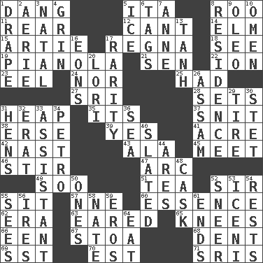 ACROSS 1. Mild oath, euphamism for damn 5. Call ___ day 8. Friend of Pooh 11. Buttocks 12. Patter 14. Shade tree 15. Nick name for Arthur 17. Rain (Swedish) 18. Perceive with the eye 19. Player piano 21. Elected rep. 22. Electrically charged atom 23. Snakelike fish 24. And not 25. Possessed 27. _ Lanka 28. Arranges properly for use 31. Pile 35. ___ a Wonderful Life 37. In a ____ (agitated or irritated) 38. Celtic language 39. Consenting reply 41. 43,560 square feet 42. Political cartoonist Thomas 43. Chicken ___ king 45. Rendezvous 46. Use a swizzle stick 47. Curve 49. "Barney Miller" actor Jack 51. Beverage made from leaves 52. Title for a knight 55. Be seated 57. Compass dir. 60. Center 62. Period 63. Having ears or earlike features 65. Leg joints 66. Car or cant ending 67. Portico 68. Incision 69. Fast jet (abbr.) 70. Eastern Standard Time (abbr.) 71. Indian titles of respect DOWN 1. Window treatment 2. Nest on high 3. Brizilian seaport 4. Smile widely 5. Frozen water 6. Labels 7. Queen of England 1702-14 8. Dwelling 9. Butter sub 10. Sign of things to come 13. Hyperbolic tangent 16. Immeasurably long periods of time 17. Noteworthy scarcity 20. Australian parrot (variant) 26. Indian state 29. Hoop that covers a wheel 30. Proofreading order 31. Coop moms 32. Part of Q.E.F. 33. Helper 34. Stone: prefix 36. Ocean 40. Scheduled 44. Ancient Greek god of war 48. Keg 50. Washington bills 52. Contemptuous expression 53. Ancient Celtic tribe of eastern Britain 54. Musical pauses 55. Observes 56. Angers 58. Nathan's nickname 59. Greek god of love 61. Extremities 64. Erode