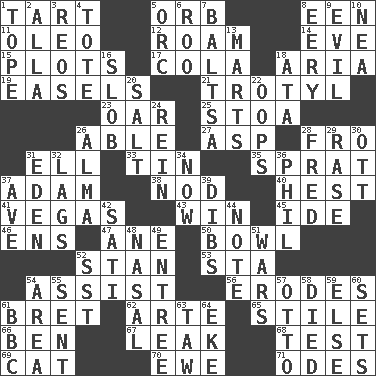 ACROSS 1. Small pie 5. Globe 8. Car or cant ending 11. Butter sub 12. Wander 14. First lady 15. Small pieces of grounds 17. Root beer relative 18. Roberta Peters solo 19. Artist's stands 21. Trinitrotoluene 23. Boat paddle 25. Portico 26. Competent 27. Viper 28. Away 31. Pipe bend 33. Shallow baking pan 35. Small fatty European fish 37. First man 38. Dreamland 40. Command 41. Viva Las _ 43. Acquire through effort 45. Binary compound 46. Followers of ems 47. A saturated hydrocarbon 50. Soup holder 52. Comedian Laurel of Laurel & Hardy 53. R.R. building 54. Aid 56. Eats (away) 61. Cy Young winner Saberhagen 62. Johnson of "Laugh-In" 65. Vertical member of a panel or frame 66. Benjamin's nick name 67. Path through which fluid escapes 68. Trial 69. Domesticated feline 70. She-sheep 71. Lyric poems DOWN 1. Drink excessively 2. Silent film actress Nazimova 3. Vintage cars 4. Carryall 5. The grampus (Milton) 6. Friend of Pooh 7. Greek mezzo-soprano Agnes 8. Suggestive of the supernatural 9. Tending to cause great harm 10. Teachers' org. 13. Shops 16. Oscar Madison type 18. _ moment's notice (2 wds.) 20. Table seasoning 22. I made a mistake 24. It's straight from the horse's mouth 26. _ mater 28. Flintstone 29. Raze (variant) 30. Baseball player Mel 31. Paradise 32. Fails to keep up a pace 34. Immediately 36. Silvers or Donahue 37. "___ Maria" 39. Claim 42. Suttee (variant) 44. Brief written record 48. Relating to the nose 49. Main course 51. Armed conflicts 52. Fast jet (abbr.) 54. Length times width 55. Posted 57. "Beetle Bailey" pooch 58. Passed on 59. Otherwise 60. Arranges properly for use 61. English channel? 63. The 23rd letter of the Hebrew alphabet 64. Make supply last