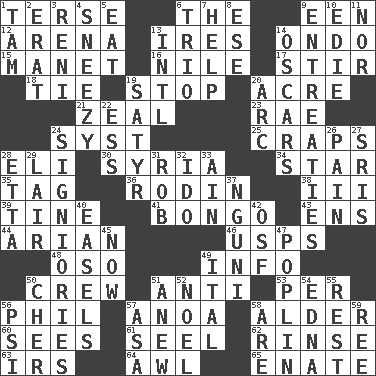 ACROSS 1. Laconic 6. Definite Article 9. Car or cant ending 12. Sports stadium 13. Angers 14. Southwest Nigerian state 15. French painter Edouard 16. Mediterranean tributary 17. Commotion 18. Neckwear 19. Discontinue 20. 43,560 square feet 21. Ardor 23. Actress Charlotte 24. System (abbr.) 25. Dice game 28. Connecticut Ivy Leaguer 30. Damascus' land 34. Play the lead 35. Label 36. "The Thinker" sculptor 38. One more than two 39. Prong on a fork 41. Beat drum 43. Followers of ems 44. Believer in; advocate of (suffix) 46. United States Postal Service (abbr.) 48. Bear (Spanish) 49. A message received and understood 50. Group working together 51. Against 53. For each 56. Silvers or Donahue 57. Small Philippine buffalo 58. Tree or shrub in the Birch family 60. Perceives with the eye 61. Sew up the eyelids of hawks and falcons 62. Wash lightly 63. Big collection agency 64. Leather borer 65. Related on the mother's side DOWN 1. Scottish cap 2. Part of Q.E.F. 3. Painter Guido (1575-1642) 4. Dwarf with a sinus problem 5. Erode 6. Musical group of three 7. Assist 8. Compass dir. 9. Pleas 10. Singer Brickell 11. Or not 13. International (abbr.) 14. Motion picture awards 19. Letch 20. Curve 22. Double-curved letter 24. Seigniories (variant) 26. Ache 27. Indian titles of respect 28. Singer James 29. Den 31. Director Reiner 32. Wedding promise 33. The 18th letter of the Arabic alphabet 37. Group of southern Bantu languages 40. Artist's stands 42. Order of Saint Francis (abbr.) 45. At this time 47. Cotton for raincoats, e.g. 49. Slanted text style (abbr.) 50. "Mermaids" star 51. Afresh 52. Christmas carol 54. Pulitzer Prize-winning author Ferber 55. Repose 56. 23rd letter of the Greek alphabet 57. White ___ sheet 58. "We ___ not amused" (Victoria) 59. Portuguese money of account (variant)