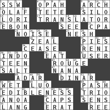 ACROSS 1. Compass dir. 4. Brightly colored fish 8. Bowlike part 12. Norwegian king 14. Wig 15. Grain storage tower 16. Australian parrot (variant) 17. Interpreter 20. Inky black, to poets 21. Observe 22. Accounting whiz (abbr.) 23. Annoying sound 27. Delicate 29. Ardor 31. Sliced desserts 34. Desist 35. Painter Guido (1575-1642) 36. Southeast Asian peninsula 39. Consume 41. One who uses or employs something 42. Adolescent 43. Makeup applied to the cheeks 46. Table seasoning 47. Nanny 48. The sixth month of the Jewish calendar 51. Middle Eastern gold or silver currency 54. Soggy 56. Nilotic language 58. Romantic infatuation 61. The property of being fit to eat 66. Musical group of three 67. Small Philippine buffalo 68. Smile enhancers 69. Elected reps. 70. Long (Scottish) 71. Part of Q.E.F. 72. To sift DOWN 1. Flatfish 2. Oscar Madison type 3. Make _____ (do battle with) 4. Baseball player Mel 5. For each 6. _ moment's notice (2 wds.) 7. Coop moms 8. White ___ sheet 9. Actors Guy, Robert Welles, and Clint 10. Hoof sound 11. Israeli folk dance 13. A pale, very dry sherry 18. Elected rep. 19. Area sheltered from the wind 24. Ending with capital 25. Ocean 26. Relaxation 28. Upset 30. Memorize 32. Compass dir. 33. Title for a knight 34. Continued (abbr.) 36. It is 37. Teachers' org. 38. Accusation by an informer 40. Frog relative 44. Single; one (prefix) 45. Separate the seeds from cotton 49. 100% 50. Regret 52. Flats, for short 53. More uncommon 54. Welt 55. Pulitzer Prize-winning author Ferber 57. Single time 59. Trig term 60. Stockings 62. Container for groceries 63. Ewer handle 64. Health resort 65. Fast jet (abbr.)