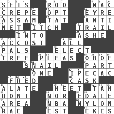 ACROSS 1. Puts into a specified state 5. Friend of Pooh 8. Big _ 11. Streamer paper 13. Elect 14. Jane of fiction 15. Indian state 16. Make lace 17. Against 18. Fish or hair follower 19. Hankering 21. Hang back 22. To the inside or interior of 24. American tennis player Robert 25. Buttonhole 27. Everything 29. Friends 30. Voters do this 32. Relationship diagram 33. Entreaties 35. Mitch Miller's instrument 39. Slow-paced one 41. Role in a play 42. Single 43. Medicinal drug used to evoke vomiting 45. Flintstone 48. Keg 49. Having winglike extensions 50. Rendezvous 52. Scottish cap 55. Do not 56. Or not 57. Peak District village in England 59. Length times width 60. Basketball assoc. 61. Thermoplastic polyamide 62. Actress Charlotte 63. Eastern Standard Time (abbr.) 64. Supplements with great effort DOWN 1. Examine minutely or intensely 2. Celtic language 3. One of the two male reproductive glands 4. Health resort 5. College mil. group 6. Brightly colored fish 7. Baseball player Mel 8. Non-adult bird? 9. Nick name for Arthur 10. To provide with a ceiling 12. Sends forth 14. Hearing organs 20. Small child 21. Baby powder 23. Olfactory organs 25. Fitting 26. 4-wheeled motor vehicle 27. Chicken ___ king 28. French article 30. Snakelike fish 31. Drinks excessively 33. Baking dish 34. Whopper 36. Sass 37. Mouth or opening 38. And so on (abbr.) 40. Thickened enlargement 43. Frozen water 44. Eucharist need 45. Plants 46. The wife of a rajah (variant) 47. Singer James 49. The sixth month of the Jewish calendar 50. Crowds into 51. Part of Q.E.F. 53. _ vera 54. Not women's 56. Compass dir. 58. Color