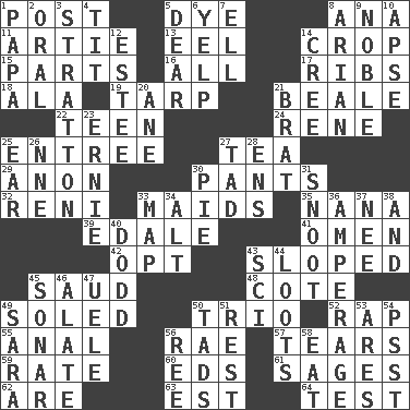 ACROSS 1. Mail 5. Color 8. Santa ___, CA 11. Nick name for Arthur 13. Snakelike fish 14. Riding implement 15. Actors' quests 16. Everything 17. Chest bones 18. According to 19. Canvas cover 21. Calif. Air Force Base 22. Adolescent 24. French philosopher Descartes 25. Main course 27. Beverage made from leaves 29. Soon (poet.) 30. Leg coverings 32. Painter Guido (1575-1642) 33. Unmarried girls 35. Nanny 39. Peak District village in England 41. Sign of things to come 42. Elect 43. Slanted 45. Saudi Arabian king (1953-1964) 48. ____ d'Azur (French Riviera) 49. Having a sole or soles 50. Musical group of three 52. Strike 55. Of or related to the anus 56. Actress Charlotte 57. Lacerates 59. Assign a rank or rating to 60. Begley and Asner 61. Gurus 62. "We ___ not amused" (Victoria) 63. Eastern Standard Time (abbr.) 64. Trial DOWN 1. Dad 2. Spoken 3. Ski resort town in Vermont 4. Teat (slang) 5. Letter starter 6. Sharp bark 7. Pipe bend 8. Believer in; advocate of (suffix) 9. Having high moral qualities 10. Domed church section 12. First name in cosmetics 14. Algonquian 20. One (Scot) 21. Naughty child 23. Bert's buddy 25. Hearing organ 26. Compass dir. 27. Small boy 28. Followers of ems 30. Sliced dessert 31. Snout, nose 33. Atlas unit 34. The first octave above the treble staff 36. Electrical Measurement 37. Born 38. Plus 40. Texas town _ City 43. _-fi 44. Plunders 45. Underwater navigation system 46. Having winglike extensions 47. Ubangi River tributary 49. "Two Mules for Sister ____" 50. Bits 51. Remainder 53. Ancient Greek god of war 54. Inconspicuous attention getter 56. To riddle 58. Consume