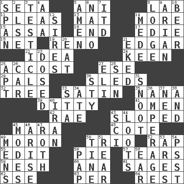 ACROSS 1. Stalk of a moss capsule 5. Cuckoo 8. Experiment locale 11. Entreaties 13. Floor covering 14. Greater amount 15. Slender Brazilian palm 16. Conclusion 17. Singer Brickell 18. Fish or hair follower 19. Former U.S. Attorney General Janet 21. _ Allan Poe 22. The content of cognition 24. Peachy ____! 25. Buttonhole 27. Compass dir. 29. Friends 30. Bobsleighs 32. Family _ (genealogy) 33. Smooth fabric 35. Nanny 39. Short, simple song 41. Sign of something about to happen 42. Actress Charlotte 43. Slanted 45. Hindu Mythology: god of death 48. ____ d'Azur (French Riviera) 49. Person of subnormal intelligence 50. Musical group of three 52. Strike 55. Prepare for publication 56. Sliced dessert 57. Lacerates 59. Soft 60. Santa ___, CA 61. Gurus 62. Compass dir. 63. For each 64. Take ten DOWN 1. Connect, as a bridge 2. Otherwise 3. One of the two male reproductive glands 4. American Automobile Association (abbr.) 5. So be it 6. Billionth: prefix 7. It would 8. Cabin 9. Believer in; advocate of (suffix) 10. Fermented drink made from hops 12. Male parents of animals 14. Ancient Persian 20. Erode 21. Supplemented with great effort 23. Administered medicine 25. Fitting 26. Auto 27. Biblical high priest 28. Elected rep. 30. Filthy place 31. Snob 33. R.R. building 34. Had dinner 36. Electrical Measurement 37. Born 38. Added to 40. SW Asia republic 43. _-fi 44. Plunders 45. Methods 46. Originate 47. Writer of Portnoy's Complaint (1969) 49. Not women's 50. Prong on a fork 51. Hitchcock's "____ Window" 53. Ancient Greek god of war 54. Inconspicuous attention getter 56. Infant food 58. Hearing organ