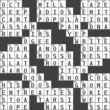 ACROSS 1. Sep. follower 4. Place where flour is made 8. Goldbrick 12. Ooze 14. Goodbye (Sp.) 16. Give off 17. Draw slowly or heavily 18. Census information 20. Indian state 22. Baking dish 23. Heredity factor (abbr.) 24. To separate or throw off 25. Big collection agency 28. Slangy assent 30. Double curve, resembling the letter S 31. Compose 35. Rowing implement 37. Small Philippine buffalo 40. Lyric poems 41. Silent film actress Nazimova 42. With motion or animation 44. Egg locale 45. Narrow board 46. Round or rotation of duties 47. Make lace 48. Composer Copland 50. "Tell ____ the Marines!" 52. Director Reiner 54. 17th letter of the Greek alphabet 55. Gear tooth 58. Part of HMS, perhaps 61. Two (Sp.) 63. Dwarf 65. Pleas 70. Migrant worker of the '30s 71. Portico 72. Tarsus (plural) 73. Soaks 74. Drink excessively 75. Political cartoonist Thomas 76. Compass dir. DOWN 1. Motion picture award 2. Stop 3. Laconic 4. Atlas unit 5. Wedding promise 6. Mouth edge 7. Central Nebraska county 8. Allow 9. Among 10. The Jewish people; Israel 11. Inactive volcano in Sicily 13. Parent Teacher Association (abbr.) 15. Kill 19. Afresh 21. Russian fighter aircraft 26. 480, 500 or 516 sheets of paper 27. Sir (Sp.) 29. Right away 30. Speaker 32. It may be bright or harebrained 33. Trial 34. Eastern Standard Time (abbr.) 35. Rounded earthenware pot or jar 36. Having or resembling wings 38. Bear (Spanish) 39. Having gotten out of bed 41. White ___ sheet 43. Pledge 49. Connecting point 51. Coat; cloak 53. Water vessel 55. Popular sodas 56. Leaves out 57. Honkers 58. Behest 59. To the inside or interior of 60. Constrict 62. Comedian Laurel of Laurel & Hardy 64. At this time 66. Actress Charlotte 67. Lyricist Gershwin 68. Curvy letter 69. Be seated