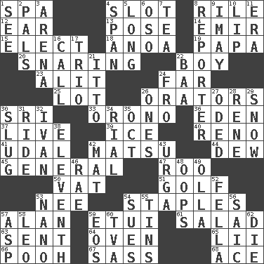 ACROSS 1. Health resort 4. Slit 8. Cause heat under the collar 12. Hearing organ 13. Introduce or present, as a question 14. Independent ruler or chieftain 15. Voters do this 18. Small Philippine buffalo 19. Dad 20. Catching in a trap 22. Male child 23. Came down and settled, as after flight 24. Distant 25. Car dealer's back yard 26. Speakers 30. _ Lanka 33. U. of Maine site 36. Genesis locale 37. Not recorded 39. Frozen water 40. Western Nevada city 41. Hereditary estate 42. Taiwanese island in East China Sea 44. Morning condensation 45. Commissioned military rank 47. Friend of Pooh 50. Large container 51. Eighteen holes 53. Born 54. Paper fasteners 57. ____ Jay Lerner 59. Needle case 61. First course 63. Transmitted 64. Baking chamber 65. Cards in a Roman deck? 66. "Silly old bear" 67. Backtalk 68. Adept person DOWN 1. Perceive with the eye 2. Friends 3. Sports stadium 4. Connect, as a bridge 5. Yearn 6. Bear (Spanish) 7. Beverage made from leaves 8. News announcer 9. "If ____ say so..." 10. Mouth edge 11. Period 16. Give a ring to 17. Musical group of three 21. "Tell ____ the Marines!" 22. Sound made by sheep 24. Back 26. Singles 27. Wrote a lyric poem 28. French philosopher Descartes 29. Frozen precipitation 30. Snaillike creature with no shell 31. Travel on an animal 32. _ the terrible 34. Monetary unit of Yemen 35. Sep. follower 38. Veterans Day date 42. Floor covering 43. Capital and largest city of Mongolia 46. Actress Charlotte 48. I made a mistake 49. Water jar 52. Man or boy (slang) 53. Billionth: prefix 54. Takes to court 55. Metal containers 56. Ketch in the Levant 57. Cleo's killer 58. Lion 59. Greek goddess of the dawn 60. Federal power corp. 62. Expire