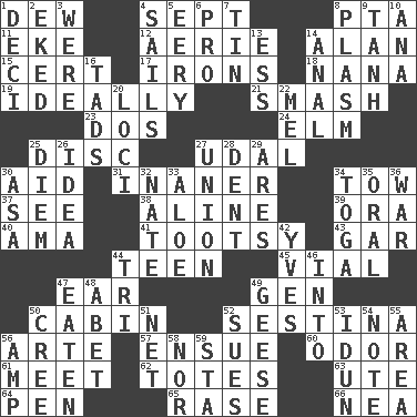 ACROSS 1. Morning condensation 4. Back-to-school mo. 8. Parent Teacher Association (abbr.) 11. Make supply last 12. Nest on high 14. Actor Alda or Thicke 15. Certainty 17. Metal shackles 18. Nanny 19. Under perfect conditions 21. Box-office sellout 23. Two (Sp.) 24. Shade tree 25. Flat circle 27. Hereditary estate 30. Help 31. Sillier 34. Pull behind 37. Observe 38. Place in a line 39. Mouth or opening 40. Nanny (var.) 41. Tootsie (variant) 43. Slender fish 44. Adolescent 45. Small bottle 47. Ewer handle 49. Commissioned mil. rank 50. Apartment or room in a ship 52. French poetic form 56. Johnson of "Laugh-In" 57. Follow as a consequence or result 60. Scent 61. Rendezvous 62. Lugs 63. Shoshoni 64. Fenced enclosure 65. To erase 66. Teachers' org. DOWN 1. Tenth: prefix 2. Supplemented with great effort 3. Past tense of be (plural) 4. Moves on water 5. Suggestive of the supernatural 6. Adept person 7. Metal container 8. Suffix with ecto or cyto 9. Hyperbolic tangent 10. Santa ___, CA 13. Curvy letter 14. Of or related to the anus 16. Small amounts or degrees 20. Event scenes 22. Cartoonist voice _ Blanc 25. South Vietnam president (1954) 26. It may be bright or harebrained 27. The state of being joined or united 28. Scratch 29. Ancient Greek god of war 30. White ___ sheet 32. Nathan's nickname 33. _ vera 34. Ancient Roman robe 35. Of the mouth 36. Armed conflict 42. Jacques Cousteau's middle name 44. Three (prefix) 46. To the inside or interior of 47. Eroded 48. Collude with 49. Honkers 50. Algonquian 51. Fish or hair follower 52. Institutes legal proceedings 53. Goddess of spring and wife of Bragi 54. Brief written record 55. Length times width 56. Electrical Unit 58. And not 59. R.R. building