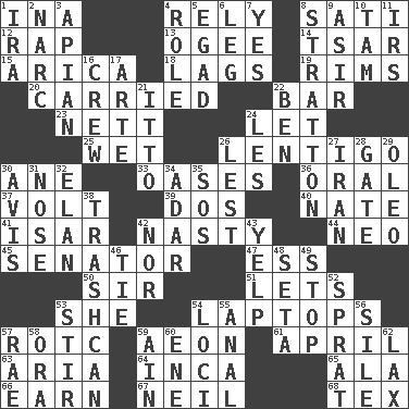 ACROSS 1. _ tizzy (2 wds.) 4. Have trust in 8. Suttee (variant) 12. Strike 13. Double curve, resembling the letter S 14. Russian ruler of old 15. N. Chile seaport 18. Falls behind 19. Basketball hoops 20. Borne 22. Oblong piece of solid material 23. Remaining after all deductions 24. Allow 25. Dripping 26. Small, flat, pigmented spot on the skin 30. A saturated hydrocarbon 33. Fertile tracts in a desert 36. Spoken 37. Electrical Unit 39. Two (Sp.) 40. Nathan's nickname 41. Austrian river, tributary to the Danube 42. Thoroughly unpleasant 44. Modern: prefix 45. Legislator 47. Curvy letter 50. Title for a knight 51. Allows 53. A female animal or person 54. Portable computers 57. College mil. group 59. Period of immesurable duration 61. Showery time 63. Operatic vocal solo 64. South American Indian 65. Wing 66. Merit 67. Famous astronaut Armstrong 68. John Ritter's dad DOWN 1. Lyricist Gershwin 2. Drug cop 3. Bee-related 4. Hero or heavy, e.g. 5. Mild oath 6. Part of a journey 7. It is so 8. Ski resort town in Vermont 9. SW Saudi Arabia district 10. Scottish cap 11. Big collection agency 16. Group working together 17. Johnson of "Laugh-In" 21. "Tell ____ the Marines!" 22. Benjamin's nick name 24. French article 26. For fear that 27. SW Asia republic 28. Yard entry 29. Margarine 30. Opinion 31. Sense of smell 32. Flair 34. The sixth month of the Jewish calendar 35. Mayday 38. File 13 42. Not either 43. Sharp bark 46. Neckwear 48. Bristle 49. Cease 52. Small fatty European fish 53. Move through with a circular motion 54. Locales 55. Of or related to the anus 56. Filth; sediment 57. Actress Charlotte 58. Mouth or opening 59. The 18th letter of the Arabic alphabet 60. Compass dir. 62. Not strict