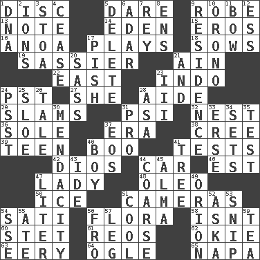 ACROSS 1. Plate 5. Have the gumption 9. Loose flowing garment 13. Brief written record 14. Locale of original sin 15. Greek god of love 16. Small Philippine buffalo 17. Romps 18. Sty mamas 19. More impudent 21. The 18th letter of the Arabic alphabet 22. 90 degrees 23. _ china 24. Pacific Standard Time (abbr.) 27. A female animal or person 28. Helper 29. Shuts with force 31. 23rd letter of the Greek alphabet 32. Egg locale 36. Flatfish 37. Epoch 38. Algonquian 39. Adolescent 40. Sometimes accompanies a hiss 41. Trials 42. "Vaya con ____" 44. Auto 46. Eastern Standard Time (abbr.) 47. Kenny Rogers chart-topper in '80 48. Butter sub 50. Frozen water 51. Devices for capturing images 54. Suttee (variant) 56. Plants 58. Is not 60. Proofreading order 61. Vintage cars 62. Migrant worker of the '30s 63. Suggestive of the supernatural 64. Stare at amorously 65. California wine valley DOWN 1. Heredity factor (abbr.) 2. Charged particles 3. Portico 4. Desist 5. Keyboard key 6. The sixth month of the Jewish calendar 7. Marina Del _, California 8. Followers of ems 9. Dwelling 10. U. of Maine site 11. Arrow shooter 12. Double-curved letter 17. Expression of disdain 20. Backtalk 21. Plus 23. One more than two 24. Inconspicuous attention getter 25. A type of plum 26. Lie 28. White ___ sheet 30. Ananias' fault 31. Adept person 33. Celtic language 34. Arranges properly for use 35. Trial 37. Greek goddess of the dawn 40. Male child 41. Woody plant 43. Binary compound 44. Unrefined 45. _ mater 47. 61 cubic inches 49. Greek mythologigal hunter 51. Calm and collected 52. "____ silly question..." 53. Clip 54. Compass dir. 55. Had dinner 56. From 57. Part of a journey 59. Afternoon social gathering