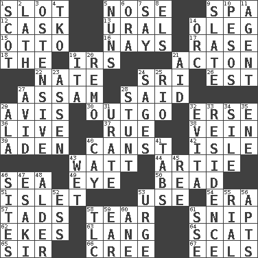 ACROSS 1. Narrow opening 5. Olfactory organ 9. Health resort 12. Keg 13. Mountain range 14. Cassini of fashion 15. Von Bismarck 16. Negative votes 17. To erase 18. Definite Article 19. Big collection agency 21. NE Massachussets city 22. Nathan's nickname 24. _ Lanka 26. Eastern Standard Time (abbr.) 27. Indian state 28. Stated 29. Deliberation 30. Expenditure 32. Celtic language 36. Moving, as bait 37. Regret 38. Distinctive style or manner 39. An important port of Yemen 40. 2nd pers. sing. pres. of can (arch.) 42. Capri or Wright 43. Electrical Unit 44. Nick name for Arthur 46. Ocean 49. Sight organ 50. Necklace unit 51. Small island 53. Purpose 54. Period 57. Bits 58. Rend 61. Clip 62. Makes supply last 63. Austrian-born American filmmaker Fritz 64. Jazz singing style 65. Title for a knight 66. Algonquian 67. Snakelike fish DOWN 1. Highlander 2. Thin strip of wood or metal 3. Clearly or manifestly demonstrative 4. Ring climax 5. Religious women 6. Mouth or opening 7. Declare 8. Raised railways 9. Schedule 10. Mexican monetary units 11. Rep 14. The grampus (Milton) 19. Call ___ day 20. San ____ (Riviera town) 21. Assist 23. NE Netherlands city 24. Gurus 25. River (Sp.) 27. Enthusiastic 28. Check the growth or development of 29. In the manner of 31. A salt of uric acid 32. Webber/Rice musical 33. Dwelling 34. Filth; sediment 35. Compass dir. 40. Island 41. Bar bills 43. Dripping 45. To riddle 46. Locates 47. 1973 Nobel Price Winner (Physics) Leo 48. Tree or shrub in the Birch family 52. Double-curved letter 53. Goad 55. Monetary unit of Yemen 56. Tenement units (abbr.) 58. Affectionate concern, for short 59. Ewer handle 60. A saturated hydrocarbon 61. Compass dir.