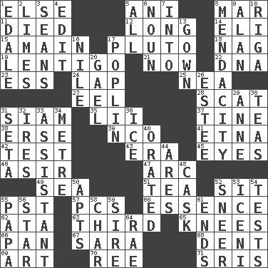 ACROSS 1. Otherwise 5. Cuckoo 8. Third mo. 11. Passed on 12. Protracted 14. Connecticut Ivy Leaguer 15. At full speed 17. Greek god of the underworld 18. Tired old horse 19. Small, flat, pigmented spot on the skin 21. Immediately 22. Heredity factor (abbr.) 23. Curvy letter 24. Pet locale 25. Teachers' org. 27. Snakelike fish 28. Go away! 31. Thailand, formerly 35. Cards in a Roman deck? 37. Prong on a fork 38. Celtic language 39. Non-commissioned officer (abbr.) 41. Inactive volcano in Sicily 42. Trial 43. Epoch 45. Snake ____ (dice throw) 46. SW Saudi Arabia district 47. Curve 49. Ocean 51. Afternoon social gathering 52. Be seated 55. Pacific Standard Time (abbr.) 57. Personal Computers (abbr.) 60. Substance 62. _ moment's notice (2 wds.) 63. One of three equal parts 65. Leg joints 66. Baking dish 67. "Two Mules for Sister ____" 68. Scratch 69. Tate display 70. To sift 71. Indian titles of respect DOWN 1. Peak District village in England 2. Citrus fruits 3. Actors Connery and Penn 4. Prepare for publication 5. Everything 6. Part of speech 7. To the inside or interior of 8. Ananias' fault 9. Actor Alda or Thicke 10. Port city in Latvia 13. Woman's formal wear 16. "Death on the ____" 17. Cotton for raincoats, e.g. 20. Highlander 26. First name in cosmetics 29. Singer Murray 30. Afternoon social gatherings 31. Bristle 32. Angers 33. Aide 34. Distance measurement (Brit.) 36. Frozen water 40. Declaimed 44. Ancient Greek god of war 48. Keg 50. Flats, for short 52. Contemptuous expression 53. Ancient Celtic tribe of eastern Britain 54. Trials 55. Dad 56. Play the lead 58. Burn to charcoal 59. Father 61. Conclusions 64. Actress Charlotte
