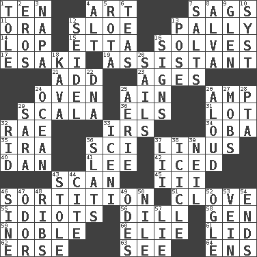 ACROSS 1. Nine, plus one 4. Tate display 7. Sinks 11. Mouth or opening 12. _ gin 13. Chummy 14. Chop off 15. Singer James 16. Finds the solution 17. 1973 Nobel Price Winner (Physics) Leo 19. Helper 21. Say or write further 23. Eons 24. Baking chamber 25. The 18th letter of the Arabic alphabet 26. Electrical Unit 29. Any of the three canals of the cochlea 30. Raised railways 31. Car dealer's back yard 32. Actress Charlotte 33. Big collection agency 34. Chief or king in Benin or Nigeria 35. Retirement account (abbr.) 36. _-fi 37. "_ and Lucy" (Charlie Brown theme song) 40. One of the 12 tribes of Israel 41. Area sheltered from the wind 42. On the rocks 43. Glance over 45. One more than two 46. Determination 51. Garlic unit 55. Foolish or stupid persons 56. Deli pickle 58. Commissioned military rank (abbr.) 59. Having high moral qualities 60. Writer Wiesel 61. Hat (slang) 62. Celtic language 63. Observe 64. Followers of ems DOWN 1. Lacquered or enameled metalware 2. Greek god of love 3. California wine valley 4. The first octave above the treble staff 5. Roll call or roster of names 6. Beverages made from leaves 7. Table seasonings 8. Inventor's middle name 9. Small, secluded valley 10. System (abbr.) 12. Beer mug 13. Introduce or present, as a question 16. Signals 18. Polynesian shrub of the pepper family 20. Travel by water 22. Heredity factor (abbr.) 24. Sea 25. Nest on high 26. Verbally 27. Crowds into 28. Parent Teacher Assoc. 29. "Two Mules for Sister ____" 32. To free from 33. Ancient Celtic tribe of eastern Britain 36. Narrow boards 37. Cards in a Roman deck? 38. Ice on the eave 39. Famous astronaut Armstrong 43. Took without asking 44. Quote 46. Trig term 47. Aroma 48. Teases 49. Lyric poems 50. The longest river in the world 52. Stare at amorously 53. Distinctive style or manner 54. Conclusions 57. Untruth
