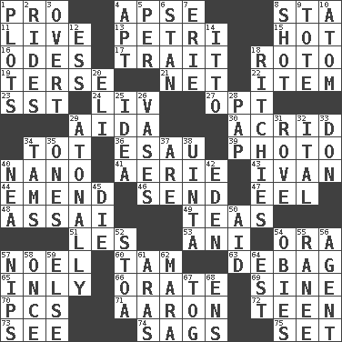 ACROSS 1. Adept person 4. Domed church section 8. R.R. building 11. Moving, as bait 13. _ dish (used to culture cells) 15. Being at a high temperature 16. Lyric poems 17. Distinguishing feature 18. Printing process, for short 19. Laconic 21. Fish or hair follower 22. A distinct part 23. Fast jet (abbr.) 24. 54 in ancient Rome 27. Elect 29. Opera by Verdi 30. Bitter 34. Small child 36. Son of Isaac 39. Picture 40. Billionth: prefix 41. Nest on high 43. _ the terrible 44. Make improvements or corrections to 46. Post 47. Snakelike fish 48. Slender Brazilian palm 49. Beverages made from leaves 51. French article 53. Cuckoo 54. Mouth or opening 57. Christmas carol 60. Scottish cap 63. Debunk (Brit. slang) 65. Inwardly 66. Speak pompously 69. Trig term 70. Personal Computers (abbr.) 71. Composer Copland 72. Adolescent 73. Perceive with the eye 74. Settles 75. Put into a specified state DOWN 1. Schemes 2. Amusement-park features 3. Unconcealed 4. Fitting 5. For each 6. Comedian Laurel of Laurel & Hardy 7. 4th largest of the Great Lakes 8. Went for two points 9. Carry 10. Tiny particle 12. Double-curved letter 14. "Tell ____ the Marines!" 18. Actors Guy, Robert Welles, and Clint 20. Biblical high priest 25. The main thing one is thinking about 26. Flower holders 28. Infant food 29. Lacking a tonal center or key 31. Be footloose 32. Slanted text style (abbr.) 33. Spanish title 34. Scottish caps 35. Washington bills 37. "We ___ not amused" (Victoria) 38. National forest in Provo, Utah 40. Teachers' org. 42. Genesis locale 45. Pass on 50. Assist 52. Portico 54. Off-Broadway awards 55. Indian princess (variant) 56. Rep 57. Pinches, bites 58. At one time in the past 59. Otherwise 61. Caspian sea tributary 62. Hindu Mythology: god of death 64. Eastern Standard Time (abbr.) 67. Coat; cloak 68. Followers of ems