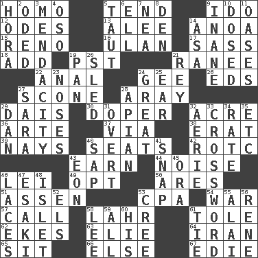 ACROSS 1. Like (prefix) 5. Be inclined (to) 9. Wedding promise 12. Lyric poems 13. Toward shelter 14. Small Philippine buffalo 15. Former U.S. Attorney General Janet 16. ____ Bator, Mongolia 17. Backtalk 18. Find the sum of 19. Pacific Standard Time (abbr.) 21. The wife of a rajah (variant) 22. Of or related to the anus 24. Unit of force equal to gravity 26. Begley and Asner 27. Biscuitlike quick bread 28. Like ___ of sunshine 29. Raised platform 30. Drug addict 32. 1/640 square mile 36. Johnson of "Laugh-In" 37. By way of 38. Part of Q.E.F. 39. Negative votes 40. Theater features 42. College mil. group 43. Merit 44. Annoying sound 46. Luau accessory 49. Elect 50. Ancient Greek god of war 51. NE Netherlands city 53. Accounting whiz (abbr.) 54. Armed conflict 57. Give a ring to 58. Cowardly lion portrayer 61. Lacquered or enameled metalware 62. Makes supply last 63. Writer Wiesel 64. SW Asia republic 65. Be seated 66. Otherwise 67. Singer Brickell DOWN 1. Israeli folk dance 2. Wrote a lyric poem 3. Ananias' fault 4. Bear (Spanish) 5. Drawn tight 6. Pipe bend 7. Teachers' org. 8. Lair 9. Empty; void 10. Administered medicine 11. Fertile tracts in a desert 14. White ___ sheet 19. Baking dish 20. Downhill vehicle 21. Marina Del _, California 23. Olfactory organs 24. Relatively large 25. Hearing organ 27. "Two Mules for Sister ____" 28. Bee-related 29. One of the 12 tribes of Israel 31. Unconcealed 32. Nest on high 33. What you're doing now 34. Pace 35. And so on (abbr.) 40. Plant excrement 41. Fastener 43. Period of immesurable duration 45. Mouth or opening 46. Shoestrings 47. 1973 Nobel Price Winner (Physics) Leo 48. Small island 52. Raised railways 53. Algonquian 55. Mountain range southwest of Kyrgyzstan 56. French philosopher Descartes 58. Area sheltered from the wind 59. Everything 60. Part of HMS, perhaps 61. Make a knot