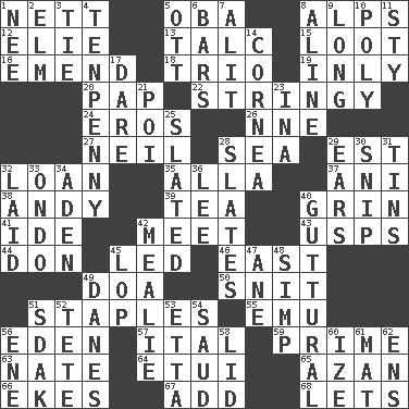 ACROSS 1. Remaining after all deductions 5. Chief or king in Benin or Nigeria 8. High mountains 12. Writer Wiesel 13. Baby powder 15. Plunder 16. Make improvements or corrections to 18. Musical group of three 19. Inwardly 20. Infant food 22. Slender, wiry 24. Greek god of love 26. Compass dir. 27. Famous astronaut Armstrong 28. Ocean 29. Eastern Standard Time (abbr.) 32. Grant temporary use of 35. Silent film actress Nazimova 37. Cuckoo 38. Actor Griffith 39. Afternoon social gathering 40. Amused look 41. Binary compound 42. Confront 43. United States Postal Service (abbr.) 44. Spanish title 45. Directed 46. 90 degrees 49. ___ good deed 50. In a ____ (agitated or irritated) 51. Paper fasteners 55. Australian flightless bird 56. Locale of original sin 57. Slanted text style (abbr.) 59. A-one 63. Nathan's nickname 64. Needle case 65. Muslim summons to prayer 66. Makes supply last 67. Say or write further 68. Allows DOWN 1. Born 2. Shade tree 3. Neckwear 4. 3-inch nail 5. Baseball player Mel 6. Drinking establishments 7. Set down 8. Place in a line 9. Yearn 10. Many (prefix) 11. Filthy place 14. Pupil covering 17. Have the gumption 21. Luau course 23. _ tizzy (2 wds.) 25. Scheduled 28. Chalkboards 29. Hearing organs 30. Clip 31. Canisters 32. Put down 33. Southwest Nigerian state 34. An important port of Yemen 36. Area sheltered from the wind 40. From the throat 42. Ear of corn 45. Chop off 47. One (Scot) 48. Simple or foolish person 49. Natives or inhabitants of Denmark 51. Neighbor of Neb. 52. Wig 53. Singer James 54. Saudi Arabian king (1953-1964) 56. Compass dir. 58. Hat (slang) 60. Ending with capital 61. Floor covering 62. Followers of ems
