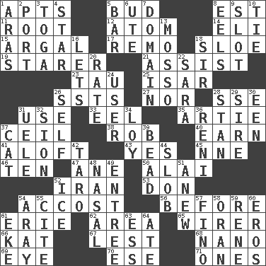 ACROSS 1. Tenement units (abbr.) 5. Partially opened flower 8. Eastern Standard Time (abbr.) 11. Carrot, for example 12. Tiny particle 14. Biblical high priest 15. Therefore, facetiously 17. San ____ (Riviera town) 18. _ gin 19. A viewer who gazes fixedly 21. Aid 23. The 19th letter of the Greek alphabet 25. Austrian river, tributary to the Danube 26. Fast planes 27. Not either 28. Compass dir. 31. Purpose 33. Snakelike fish 35. Nick name for Arthur 37. To provide with a ceiling 38. Director Reiner 40. Merit 41. High up in or into the air 43. Consenting reply 45. Compass dir. 46. "___ Little Indians" 47. A saturated hydrocarbon 50. Mountain range southwest of Kyrgyzstan 52. SW Asia republic 53. Spanish title 54. Buttonhole 56. Prior to 61. 4th largest of the Great Lakes 62. Length times width 65. One who wires 66. Krazy ___ of comics 67. For fear that 68. Billionth: prefix 69. Sight organ 70. Compass dir. 71. Washington bills DOWN 1. Caspian sea tributary 2. Left side of a ship or aircraft 3. Ancient Roman robe 4. Play the lead 5. Oblong piece of solid material 6. Shoshoni 7. Realm 8. Snakelike fish 9. Narrow, elongated depression 10. Neckwear 13. With motion or animation 16. Allows 18. Title for a knight 20. Assign a rank or rating to 22. "Two Mules for Sister ____" 24. One who makes use of a thing 26. Automatically 28. Comedian Laurel of Laurel & Hardy 29. Beget 30. Car or cant ending 31. Ubangi River tributary 32. The Jewish people; Israel 34. Myrna of the movies 36. Painter Guido (1575-1642) 37. Domesticated feline 39. Necklace unit 42. Pacific island yam 44. Oscar Madison type 48. Relating to the nose 49. Main course 51. Afresh 52. Frozen water 54. Like ___ of sunshine 55. Quote 57. A pale, very dry sherry 58. Northwest Algerian city 59. French philosopher Descartes 60. Greek god of love 61. Supplement with great effort 63. Double-curved letter 64. Had dinner
