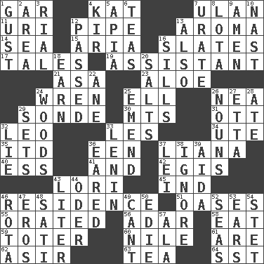 ACROSS 1. Slender fish 4. Krazy ___ of comics 7. ____ Bator, Mongolia 11. RI univ. 12. Corncob 13. Odor 14. Ocean 15. Operatic vocal solo 16. Chalkboards 17. Lies 19. Helper 21. White ___ sheet 23. _ vera 24. Songbird 25. Pipe bend 26. Teachers' org. 29. Message 30. Mountains (abbr.) 31. Baseball player Mel 32. Lion 33. French article 34. Shoshoni 35. It would 36. Car or cant ending 37. Climbing, woody, usually tropical vines 40. Double-curved letter 41. Also 42. Armor plate that protects the chest 43. Australian parrot (variant) 45. Indiana (abbr.) 46. Dwelling 51. Fertile tracts in a desert 55. Declaimed 56. The sixth month of the Jewish calendar 58. Erode 59. Carrier 60. The longest river in the world 61. "We ___ not amused" (Victoria) 62. SW Saudi Arabia district 63. Afternoon social gathering 64. Fast jet (abbr.) DOWN 1. Abrupt rush of wind 2. Length times width 3. Monetary unit of Yemen 4. Apertif with cassis 5. Capital of Western Samoa 6. Beverages made from leaves 7. A salt of uric acid 8. Globular water bottle used in Asia 9. So be it 10. Political cartoonist Thomas 12. Went by 13. In addition 16. Beverly of Met fame 18. Merit 20. Table seasonings 22. A saturated hydrocarbon 24. Forest 25. Make improvements or corrections to 26. Parts of speech 27. Singer James 28. Had dinner 29. Arranges properly for use 32. Untruth 33. Soviet premier 1918-24 36. Having ears or earlike features 37. Luau accessory 38. Fail to notice 39. Opera by Verdi 43. 61 cubic inches 44. River in Europe 46. Round or rotation of duties 47. Greek god of love 48. Suttee (variant) 49. Patter 50. Singer Brickell 52. Oceans 53. Hearing organs 54. Proofreading order 57. Insect wing