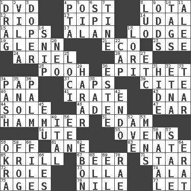 ACROSS 1. Movie disc 4. Mail 8. Globular water bottle used in Asia 12. _ de Janeiro 13. Native american tent (variation) 14. Hereditary estate 15. High mountains 17. Actor Alda or Thicke 18. Cabin 19. American astronaut and politician John 21. Environmental prefix 23. Compass dir. 24. Satellite of Uranus 26. "We ___ not amused" (Victoria) 28. "Silly old bear" 30. Curse 34. Infant food 37. Smile enhancers 39. Quote 40. Santa ___, CA 41. Feeling or showing extreme anger 43. Heredity factor (abbr.) 44. Flatfish 46. An important port of Yemen 47. Hearing organ 48. More overdramatic by comparison 51. Dutch treat 54. Shoshoni 55. Baking chambers 58. Below a satisfactory level 61. A saturated hydrocarbon 63. Related on the mother's side 65. Shrimp-like planktonic crustaceans 67. Fermented drink made from hops 71. Play the lead 72. Hero or heavy, e.g. 73. Spanish pot 74. Insect wing 75. Eons 76. Mediterranean tributary 77. Allow DOWN 1. To trail on the ground 2. Country estate 3. Drug addict 4. Parent Teacher Association (abbr.) 5. Petroleum 6. Health resort 7. Prong on a fork 8. Nilotic language 9. Likelihood 10. Labels 11. Toward shelter 16. Clip 18. Australian parrot (variant) 20. Modern: prefix 22. Head covering 25. Event scenes 27. And so on (abbr.) 29. Ethiopian city, capital of Harari 30. First name in cosmetics 31. Flintstone garb 32. Inactive volcano in Sicily 33. Pull apart 34. Romantic infatuation 35. Small Philippine buffalo 36. Inside of hand 38. Groovy apt. 42. Inside; within (prefix) 45. Australian flightless bird 49. Slanted text style (abbr.) 50. Car or cant ending 52. "___ Maria" 53. Not women's 56. Brizilian seaport 57. Showing deterioration from age 58. Gumbo ingredient 59. Toadlike animal 60. Do some clerical work 62. Inky black, to poets 64. Part of Q.E.F. 66. French article 68. Biblical high priest 69. Pipe bend 70. Actress Charlotte