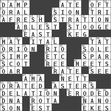 ACROSS 1. Moist 5. Had dinner 8. Often (poetically) 11. Spoken 12. The Jewish people; Israel 13. Three (prefix) 14. Anew 17. Ski resort town in Vermont 19. Most capable 21. Moe Howard, for one 22. 90 degrees 23. Cask 24. Floor covering 27. Slanted text style (abbr.) 29. Make lace 32. Constellation of myth 34. River (Sp.) 36. Flatfish 37. Simple or foolish person 38. And so on (abbr.) 39. Practice fight 40. Native of Scotland 41. To sift 42. Confronts 43. Rowing implement 44. Pace 46. Observe 47. Wet nurse (var.) 50. Remaining after all deductions 52. Declaimed 55. Michaelmas daisies 57. Accusation by an informer 59. Worn away 62. Heredity factor (abbr.) 63. Roll call or roster of names 64. Billionth: prefix 65. Male offspring 66. Eastern Standard Time (abbr.) 67. Supplements with great effort DOWN 1. ___ good deed 2. Sandy's bark 3. Hindu Mythology: god of death 4. Cadet 5. Small island 6. Cod relative 7. Related on the mother's side 8. "Beetle Bailey" pooch 9. Toadlike animal 10. Prong on a fork 12. Fast jet (abbr.) 15. Killed 16. Command 18. Coat; cloak 20. A viewer who gazes fixedly 24. With motion or animation 25. N. Chile seaport 26. Southeast Indonesia island 28. 61 cubic inches 29. Drinks excessively 30. Having winglike extensions 31. Laconic 33. Elect 35. Seas 36. Compass dir. 42. Distance measurement 45. False hair 47. _ moment's notice (2 wds.) 48. Distance measurement (Brit.) 49. Goodbye (Sp.) 51. Marketplace scale 52. Probability 53. Western Nevada city 54. Actor Alda or Thicke 55. Santa ___, CA 56. Neighbor of Neb. 58. Baseball player Mel 60. Compass dir. 61. Two (Sp.)