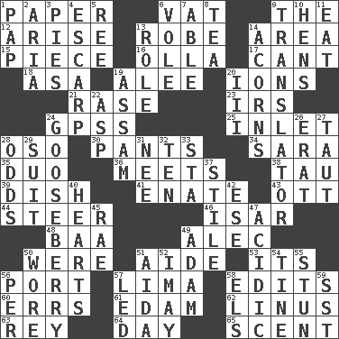ACROSS 1. Some stationery 6. Large container 9. Definite Article 12. Ascend 13. Loose flowing garment 14. Length times width 15. Component 16. Water jar 17. Patter 18. White ___ sheet 19. Toward shelter 20. Charged particles 21. To erase 23. Big collection agency 24. Global Positioning Systems (abbr.) 25. An arm off of a larger body of water 28. Bear (Spanish) 30. Leg coverings 34. "Two Mules for Sister ____" 35. Superhero pair 36. Confronts 38. The 19th letter of the Greek alphabet 39. Food container 41. Related on the mother's side 43. Baseball player Mel 44. Navigate 46. Austrian river, tributary to the Danube 48. Sound made by sheep 49. Actor Baldwin 50. We are 51. Assistant 53. It is 56. Sweet dark-red dessert wine 57. Pale green bean 58. Prepares for publication 60. Blunders 61. Dutch treat 62. "_ and Lucy" (Charlie Brown theme song) 63. Marina Del _, California 64. 24 hours 65. Aroma DOWN 1. Infant food 2. Roberta Peters solo 3. Sliced desserts 4. Fortification 5. To riddle 6. Grand slam 7. Competent 8. Beverage made from leaves 9. Interpreter 10. Coop moms 11. Consume 13. Hero or heavy, e.g. 14. Oak nuts 19. Indian state 20. One more than two 22. Viper 24. Sour, prickly fruit 26. Part of Q.E.F. 27. Strained 28. Likelihood 29. Set or collection 31. Born 32. Nine, plus one 33. R.R. building 37. Vertical member of a panel or frame 40. Centers of feelings and intuitions 42. Compass dir. 45. Actress Charlotte 47. Being or containing an acid 49. First of billions? 50. Had on 51. Opera by Verdi 52. "If ____ say so..." 54. Prong on a fork 55. Astound 56. For each 57. Directed 58. Raised railways 59. Fast jet (abbr.)