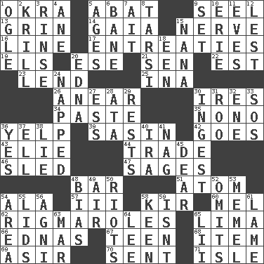 ACROSS 1. Gumbo ingredient 5. Blind as ____ 9. Sew up the eyelids of hawks and falcons 13. Broad smile 14. Greek goddess of the earth (variant) 15. Effrontery 16. Actor's bit 17. Pleas 19. Raised railways 20. Compass dir. 21. Elected rep. 22. Eastern Standard Time (abbr.) 23. Grant temporary use of 25. _ tizzy (2 wds.) 26. Approach 30. Angers 34. Thick mixture 35. Words to Nanette 36. Sharp bark 39. Indian antelope 42. Travels 43. Writer Wiesel 44. Swap 46. Downhill vehicle 47. Gurus 48. Oblong piece of solid material 51. Tiny particle 54. Wing 57. One more than two 58. Apertif with cassis 60. Cartoonist voice _ Blanc 62. Frustrating wastes of time 65. Pale green bean 66. Ferber et al. 67. Adolescent 68. A whole individual unit 69. SW Saudi Arabia district 70. Posted 71. Capri or Wright DOWN 1. Stare 2. The principal food of baleen whales 3. Remove soap 4. A saturated hydrocarbon 5. Eras 6. Object of repulsion 7. Small island 8. Tarsus (plural) 9. Arrange properly for use 10. One of the Great Lakes 11. Nights before holidays 12. For fear that 15. Grandmother 18. Car or cant ending 20. Pulitzer Prize-winning author Ferber 24. Slept 27. Curvy letter 28. "One Day ___ Time" 29. Musical pauses 30. Eat 31. Friend of Pooh 32. Compass dir. 33. Distress signal 36. It is so 37. Pipe bend 38. Whopper 40. Retirement account (abbr.) 41. Tired old horse 45. Letter starter 48. Prejudice 49. Atmosphere 50. Debaucheries 52. Leaves out 53. Klaipeda city 54. Type of rug 55. Hats (slang) 56. Hindu god of fire 58. Peachy ____! 59. Is not 61. Unable to walk 63. Make imperfect 64. Area sheltered from the wind 65. Cards in a Roman deck?