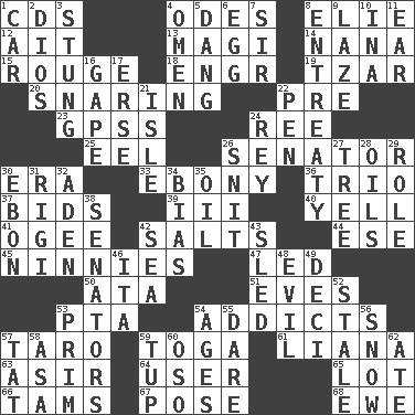 ACROSS 1. Music discs 4. Lyric poems 8. Writer Wiesel 12. Small island 13. Wise men 14. Grandmother 15. Makeup applied to the cheeks 18. Engineer (abbr.) 19. Czar 20. Catching in a trap 22. Before (prefix) 23. Global Positioning Systems (abbr.) 24. To riddle 25. Snakelike fish 26. Elected representative 30. Epoch 33. Black 36. Musical group of three 37. Auction offers 39. One more than two 40. Shout 41. Double curve, resembling the letter S 42. Table seasonings 44. Compass dir. 45. Simpletons 47. Directed 50. _ moment's notice (2 wds.) 51. Nights before holidays 53. Parent Teacher Assoc. 54. Inveterate users 57. Pacific island yam 59. Ancient Roman robe 61. Climbing, woody, usually tropical vines 63. SW Saudi Arabia district 64. One who uses or employs something 65. Car dealer's back yard 66. Scottish caps 67. Introduce or present, as a question 68. She-sheep DOWN 1. Automobile 2. "Vaya con ____" 3. Feeling sharp psychological pain 4. Sign of things to come 5. Mild oath, euphamism for damn 6. Oval reproductive body of a fowl 7. Title for a knight 8. Plea 9. Goldbrick 10. _ tizzy (2 wds.) 11. Hearing organ 16. Yawn 17. Celtic language 21. Small island 22. Animal enclosure 24. Marina Del _, California 26. In a ____ (agitated or irritated) 27. Relationship diagram 28. Petroleums 29. Hero or heavy, e.g. 30. Inky black, to poets 31. Swiss mountan, "Queen of the Mountains" 32. Arabian gulf 34. Prejudice 35. Petroleum 38. Elected representatives 42. Ocean 43. Downhill vehicle 46. Call ___ day 48. Morally bad or wrong 49. Tenth: prefix 52. Lacking originality or spontaneity 53. Demure 54. Ripens 55. Have the gumption 56. Overwhelm 57. Make lace 58. White ___ sheet 59. Uncastrated adult male sheep 60. Bear (Spanish) 62. Had dinner