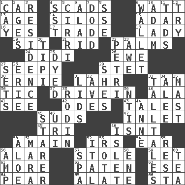 ACROSS 1. Auto 4. Oodles 9. Electrical Unit 13. Ripen 14. Grain storage towers 15. The sixth month of the Jewish calendar 16. It is so 17. Exchange 18. Kenny Rogers chart-topper in '80 19. Be seated 21. To free from 22. Insides of hands 24. "You Light Up My Life" star Conn 26. She-sheep 27. Not well drained, as in land 29. Proofreading order 30. Bert's buddy 31. Cowardly lion portrayer 33. Scottish cap 36. Nervous spasm 37. Popular '50s hangout 40. In the manner of 41. Perceive with the eye 42. Lyric poems 43. Lies 45. Beer foam 47. An arm off of a larger body of water 48. Three (prefix) 49. Is not 50. With great haste 52. Big collection agency 54. Hearing organ 56. Having or resembling wings 57. Took without asking 59. Allow 61. Greater amount 62. Eucharist need 63. Compass dir. 64. Lightbulb-shaped fruit 65. Having winglike extensions 66. R.R. building DOWN 1. Island 2. Grows older 3. Dwelling 4. Fast jet (abbr.) 5. High-altitude cloud 6. Mountain range southwest of Kyrgyzstan 7. Texas town _ City 8. Compass dir. 9. Place for singles 10. First of billions? 11. Bits 12. Attempt to accomplish something 20. Native american tent (variation) 22. _ dish (used to culture cells) 23. Deep reverence 25. Colored 27. Arranges properly for use 28. 4th largest of the Great Lakes 29. "______ My Girl" (Turtles hit) 31. Hats (slang) 32. "___ Maria" 33. Baron Munchausen's specialties 34. Toward shelter 35. Vertical spar for supporting sails 38. "The Thinker" sculptor 39. Nuclear Threat Initiatives 44. Queen of England 1702-14 45. A viewer who gazes fixedly 46. RI univ. 49. Small island 50. Medicinal plant 51. Hindu Mythology: god of death 52. Slanted text style (abbr.) 53. Roll call or roster of names 55. State of inaction 56. Electrical Unit 57. Health resort 58. Compass dir. 60. Beverage made from leaves