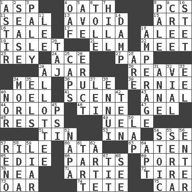 ACROSS 1. Viper 4. Pledge 8. Personal Computers (abbr.) 11. Lick closed 13. Prevent from happening 15. Nonscientific branch of learning 16. Lie 17. Man or boy (slang) 18. Toward shelter 19. Small island 21. Shade tree 22. Rendezvous 23. Marina Del _, California 24. Adept person 27. Infant food 29. Partly open 30. Break or tear apart 34. Cartoonist voice _ Blanc 36. Whimper 39. Bert's buddy 40. Christmas carol 41. Aroma 43. Of or related to the anus 44. Fourth or lowest deck 46. Prong on a fork 47. Set 48. Musical pauses 49. Ubangi River tributary 51. Metal container 53. _ tizzy (2 wds.) 54. Compass dir. 57. Cause heat under the collar 60. "One Day ___ Time" 63. Eucharist need 65. Singer Brickell 66. Actors' quests 69. Left side of a ship or aircraft 70. Teachers' org. 71. Nick name for Arthur 72. Hoop that covers a wheel 73. Boat paddle 74. Wig 75. 4-wheeled motor vehicle DOWN 1. Moving about 2. Gospel singer Marvin 3. Friendly 4. Clumsy lout 5. "___ Maria" 6. Lacquered or enameled metalware 7. Land elevation 8. Diluted with white 9. Algonquian 10. Proofreading order 12. Area sheltered from the wind 14. Moist 18. Electrical Measurement 20. _ Mahal 25. Smile enhancers 26. Spew [out] 28. "We ___ not amused" (Victoria) 29. One to whom something is allotted 31. Queen of England 1702-14 32. Small bottle 33. Snakelike fish 34. Greater amount 35. Snakelike fish 37. Flowery wreath 38. World-weariness 40. Or not 42. Adolescent 45. 23rd letter of the Greek alphabet 50. Pet locale 52. California wine valley 54. Unemotional 55. Spanish missionary in California 56. Keyboard key 57. Western Nevada city 58. The main thing one is thinking about 59. One who doesn't tell the truth 61. Small pie 62. Johnson of "Laugh-In" 64. Fitting 67. Teat (slang) 68. Observe