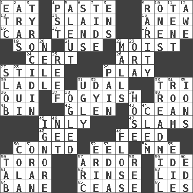 ACROSS 1. Consume 4. Thick mixture 9. Roll call or roster of names 13. Attempt 14. Killed 15. Afresh 16. Automobile 17. Is inclined (to) 18. French philosopher Descartes 19. Manchild 21. Purpose 22. Damp 24. Foregone conclusion 26. Tate display 27. Vertical member of a panel or frame 29. Romp 30. Dipping utensil 31. Allodial 33. Three (prefix) 36. Fr. "Yes" 37. Out of fashion; old fashioned 40. Friend of Pooh 41. Storage container 42. Small, secluded valley 43. Sea 45. In an inward manner 47. Shuts with force 48. Turn to the right 49. Nourish 50. Continued (abbr.) 52. Snakelike fish 54. Madame (abbr.) 56. "Corrida" creature 57. Zeal 59. Binary compound 61. Having or resembling wings 62. Wash lightly 63. Flaplike covering 64. Object of repulsion 65. Desist 66. French article DOWN 1. And so on (abbr.) 2. Caspian sea tributary 3. Polypeptide antibiotic 4. Pacific Standard Time (abbr.) 5. Eskimo relative 6. Without 7. Periodic rise and fall of the sea level 8. Followers of ems 9. Noteworthy scarcity 10. Singles 11. Portable shelter 12. Deep reverence 20. 1994 drama film starring Jodie Foster 22. Shopping centers 23. Mouth or opening 25. Coral ridge 27. Messy guy 28. "Change" in Tahitian 29. Ache 31. Repulsive 32. Color 33. Excercise machine 34. Wander aimlessly 35. Charged particles 38. Stared 39. Stockings 44. To starve (Brit.) 45. Refuse to acknowledge 46. Fish or hair follower 49. Soft thread for cleaning between teeth 50. Root beer relative 51. Northwest Algerian city 52. One of the Great Lakes 53. Pulitzer Prize-winning author Ferber 55. Singer Brickell 56. Keyboard key 57. Curve 58. To riddle 60. Begley and Asner