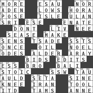 ACROSS 1. Greater amount 5. He sold his birthright 9. Not either 12. Arabian gulf 13. Coldest temperatures 14. Israeli folk dance 15. Airs 16. Capri or Wright 17. Uhlan (variant) 18. _ Lanka 19. Compass dir. 21. Maternal 22. Do not 24. 54 in ancient Rome 26. Born 27. Gospel singer Marvin 28. Create 29. Elected reps. 30. Sadhe (variant) 32. Fast planes 36. At one time in the past 37. Lubricate 38. Christmas carol 39. Lyric poems 40. Tree or shrub in the Birch family 42. Like ___ of sunshine 43. Auction offers 44. Prepares for publication 46. Curvy letter 49. Sis' sibling 50. Indonesian resort city 51. Unemotional 53. Compass dir. 54. The 19th letter of the Greek alphabet 57. Old (Scot.) 58. Stalk of a moss capsule 61. Trig term 62. Leg joint 63. SW Asia republic 64. Instrument 65. It would 66. Scottish caps 67. Singer Murray DOWN 1. Atlas contents 2. Scent 3. Dwelling 4. Compass dir. 5. Writer Wiesel 6. Mayday 7. Leather borer 8. Purpose 9. Pitcher Ryan 10. Speak pompously 11. Indian princess (variant) 14. Attila the _ 19. Followers of ems 20. Proofreading order 21. Night before a holiday 23. Fertile tracts in a desert 24. Dipping utensil 25. Eisenhower's nickname 27. Post 28. Unmarried girls 29. "Barney Miller" actor Jack 31. Twentieth part of a lira 32. Slow-paced one 33. Drawing lots 34. Afternoon social gatherings 35. Wily 40. Atmosphere 41. Confederate soldiers (slang) 43. English channel? 45. Obsolete 46. 1973 Nobel Price Winner (Physics) Leo 47. Difficult or unusual or dangerous feat 48. Having a sole or soles 52. Binary compound 53. Without 55. Soon (poet.) 56. Ubangi River tributary 58. Be seated 59. Period 60. Scottish cap 61. R.R. building