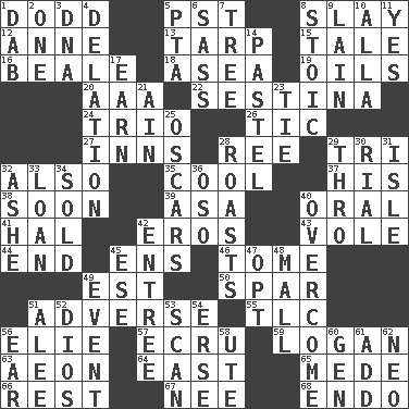 ACROSS 1. Texas town _ City 5. Pacific Standard Time (abbr.) 8. Kill 12. Singer Murray 13. Canvas cover 15. Lie 16. Calif. Air Force Base 18. At sea 19. Petroleums 20. Auto club (abbr.) 22. French poetic form 24. Musical group of three 26. Nervous spasm 27. Restaurants 28. Portuguese money of account (variant) 29. Three (prefix) 32. In addition 35. Calm and collected 37. Part of HMS, perhaps 38. Within a short period 39. White ___ sheet 40. Taken by mouth 41. Actor Linden 42. Greek god of love 43. Grand slam 44. Conclusion 45. Followers of ems 46. Heavy book 49. Eastern Standard Time (abbr.) 50. Practice fight 51. Contrary to your interests or welfare 55. Affectionate concern, for short 56. Writer Wiesel 57. Shade of tan 59. Utah city north of Ogden 63. Age 64. 90 degrees 65. Ancient Persian 66. State of inaction 67. Born 68. Inside; within (prefix) DOWN 1. Small moist lump or mass 2. Single 3. Heredity factor (abbr.) 4. Conveyance 5. Parent Teacher Assoc. 6. Backtalk 7. Woody plant 8. Unemotional 9. (Had) reclined 10. Silent film actress Nazimova 11. Consenting reply 14. Soft color 17. Merit 21. The 18th letter of the Arabic alphabet 23. Make a knot 25. Motion picture awards 28. Cooks with dry heat, as in an oven 29. Through, poetically 30. Monetary unit of Yemen 31. Small island 32. American tennis player Robert 33. Grant temporary use of 34. Exchanged or delivered for money 36. Bear (Spanish) 40. Conquer 42. Main course 45. Compass dir. 47. Choose 48. Promenade 49. Incident 51. Toward shelter 52. "Vaya con ____" 53. Glance over 54. Celtic language 56. Hearing organ 58. Shoshoni 60. Commissioned military rank (abbr.) 61. Say or write further 62. Modern: prefix