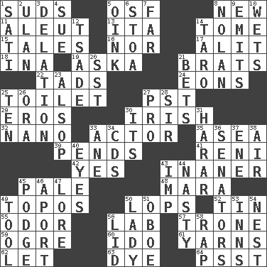 ACROSS 1. Beer foam 5. Order of Saint Francis (abbr.) 8. ___ Haven, CT 11. Native American of Southwest Alaska 13. Call ___ day 14. Heavy book 15. Falsehoods 16. And not 17. Set down 18. _ tizzy (2 wds.) 19. "____ silly question..." 21. Naughty children 22. Bits 24. Immeasurably long periods of time 25. Rest room 27. Pacific Standard Time (abbr.) 29. Greek god of love 30. From or relating to Ireland 32. Billionth: prefix 33. Thespian 35. Toward the sea 39. Hangs 41. Painter Guido (1575-1642) 42. Affirmative reply 43. More empty; more void 45. Diluted with white 48. Hindu Mythology: god of death 49. Traditional theme or motif 50. Chops off 52. Shallow baking pan 55. Aroma 56. Experiment locale 57. Marketplace scale 59. Legendary monster 60. Wedding promise 61. Tall tales 62. Allow 63. Color 64. Inconspicuous attention getter DOWN 1. Suttee (variant) 2. Uhlan (variant) 3. Conveyance 4. Institute legal proceedings 5. Pig sound 6. Portico 7. Distant 8. Pitcher Ryan 9. Sends forth 10. Moistens 12. Sadhe (variant) 14. Edible starchy tuberous root 20. Fast jet (abbr.) 21. Wagers 23. Columnist Joseph or Stewart 25. "___ Little Indians" 26. Mouth or opening 27. Adept person 28. Title for a knight 30. ___ a Wonderful Life 31. Ethiopian city, capital of Harari 33. A saturated hydrocarbon 34. Music discs 36. Legislators 37. Compass dir. 38. Atmosphere 40. Snake ____ (dice throw) 43. Mischievous child 44. Characterized by obscenity 45. Plash 46. To the left, to Queeg 47. Old wives' tales, e.g. 49. Instrument 50. Kenny Rogers chart-topper in '80 51. Mitch Miller's instrument 53. Lodging establishments 54. Egg locale 56. Hat (slang) 58. Reproach for some lapse or misdeed