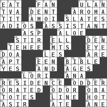 ACROSS 1. Consume 4. Air blower 7. ____ Bator 11. Federal power corp. 12. Scratch 13. Odor 14. Teat (slang) 15. Mine, in Marseilles 16. Chalkboards 17. Goodbye (Sp.) 19. Aide 21. Cleo's killer 23. _ vera 24. Agitate 25. Pipe bend 26. Lair 29. Giggle 30. Mountains (abbr.) 31. Sight organ 32. ___ good deed 33. French article 34. "We ___ not amused" (Victoria) 35. Fitting 36. Car or cant ending 37. Instruction Manual for Humans 40. Affirmative reply 41. Added to 42. Eons 43. Australian parrot (variant) 45. Santa ___, CA 46. Dwelling 51. More peculiar 55. Declaimed 56. Scent 58. Chief or king in Benin or Nigeria 59. Hauls 60. Actor's bit 61. Being at a high temperature 62. SW Saudi Arabia district 63. Had dinner 64. A saturated hydrocarbon DOWN 1. Singer James 2. Enthusiastic 3. Jacques of French films 4. Opposite of masc. 5. Small Philippine buffalo 6. Nuclear Threat Initiatives 7. A salt of uric acid 8. Globular water bottle used in Asia 9. So be it 10. Political cartoonist Thomas 12. Hyrax 13. In addition 16. Beverly of Met fame 18. Pledge 20. Table seasonings 22. Before (prefix) 24. Theater features 25. Make improvements or corrections to 26. Allots cards 27. Jane of fiction 28. Born 29. Drink excessively 32. 24 hours 33. Soviet premier 1918-24 36. Having ears or earlike features 37. Sound made by sheep 38. Snub 39. Necklace unit 43. 61 cubic inches 44. Lyric poems 46. Roll call or roster of names 47. Greek god of love 48. Suttee (variant) 49. Root beer relative 50. Prepare for publication 52. Capital of the state of Qatar 53. Inky black, to poets 54. Pace 57. Single