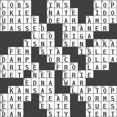 ACROSS 1. Tennis shots 5. Big collection agency 8. Trim (branches) 11. Migrant worker of the '30s 12. Nathan's nickname 14. Wedding promise 15. A salt of uric acid 17. Letter starter 18. Mine, in Marseilles 19. Went by 21. Sillier 23. Lion 25. Capital of Latvia 26. Is not 27. Elected rep. 28. Alias (abbr.) 31. Opposite of masc. 33. R.R. building 35. Small island 37. Moist 38. The grampus (Milton) 40. Water jar 41. Ascend 43. Away 45. Pet locale 46. Dripping 47. Born 50. One of the Great Lakes 52. Pulitzer Prize-winning author Ferber 53. Armed conflict 54. Sunflower state 56. Portable computer 61. Unable to walk 62. Rend 65. Typical models 66. First lady 67. Writer Wiesel 68. Institutes legal proceedings 69. Daniel's nick name 70. Filthy place 71. Portable shelter DOWN 1. Central Nebraska county 2. Gumbo ingredient 3. Prejudice 4. Puts into a specified state 5. Working for oneself (abbr.) 6. Actress Charlotte 7. Flight of steps 8. Welles in "The Third Man" 9. Aroma 10. Luau course 13. Bert's buddy 16. Snakelike fish 18. Santa ___, CA 20. Cub Scout units 22. Hindu god of fire 24. Von Bismarck 26. Naughty children 28. Silent film actress Nazimova 29. Seaweed 30. _ moment's notice (2 wds.) 31. Conductor's collection 32. Give off 34. Sandy's bark 36. Not divided or shared with others 37. Fool 39. Group working together 42. Extremities 44. Of the mouth 48. Related on the mother's side 49. Artist's stands 51. SW Asia republic 52. Compass dir. 54. Polynesian shrub of the pepper family 55. So be it 57. Mail 58. Loyal 59. Presage 60. Inconspicuous attention getter 61. Directed 63. Small island 64. Marina Del _, California