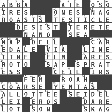 ACROSS 1. Swedish rock group 5. Had dinner 8. Bear (Spanish) 11. Angers 12. Singles 13. Tired old horse 14. Cooks with dry heat, as in an oven 17. A testis 19. Cease 21. Cigar-shaped 22. Billionth: prefix 23. Ocean 24. Atlas unit 27. Small valley 29. Automobile 32. Peak District village in England 34. By way of 36. Actor's bit 37. Prong on a fork 38. Shade tree 39. Ancient Greek god of war 40. Printing process, for short 41. Plant excrement 42. Small fatty European fish 43. Curvy letter 44. To provide with a ceiling 46. Big collection agency 47. Opposite of masc. 50. Wander aimlessly 52. Unrefined 55. Gossips 57. One to whom something is allotted 59. Beer mug 62. Flowery wreath 63. Greek god of love 64. Have the gumption 65. Car dealer's back yard 66. Male offspring 67. Heroin DOWN 1. Wind 2. Sis' sibling 3. Necklace unit 4. NE Netherlands city 5. One (Scot) 6. Trials 7. First name in cosmetics 8. At one time in the past 9. Table seasoning 10. Double curve, resembling the letter S 12. Baseball player Mel 15. Sadhe (variant) 16. Trig term 18. Retirement account (abbr.) 20. Finds the solution 24. Distance measurement (Brit.) 25. Goodbye (Sp.) 26. Leg coverings 28. Pale purple color 29. High-altitude cloud 30. Approach 31. Musical pauses 33. Lion 35. Electrical Unit 36. Infant locale 42. Chalkboard 45. Charged atoms 47. Away 48. _____ Park, CO 49. Paris' subway 51. Unmarried girls 52. Give a ring to 53. Butter sub 54. Came down and settled, as after flight 55. It is so 56. Neighbor of Neb. 58. Age 60. Epoch 61. Part of a journey
